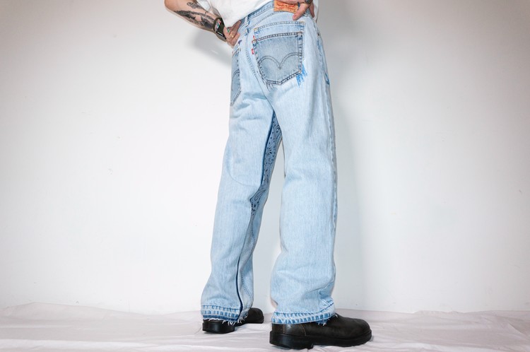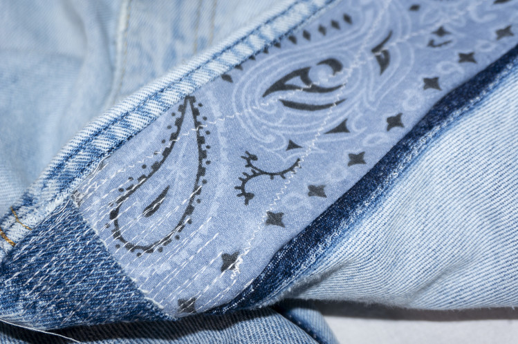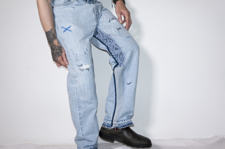 East oklm, The hand remake denim으로 깔끔한 연청 색상의 Levis 505 팬츠에 데미지 작업 및 지그재그 스티치 작업과 안심을 다른 리바이스 데님 팬츠의 뒷면, 반다나의 조각으로 채운 리메이크 데님 팬츠 상품.