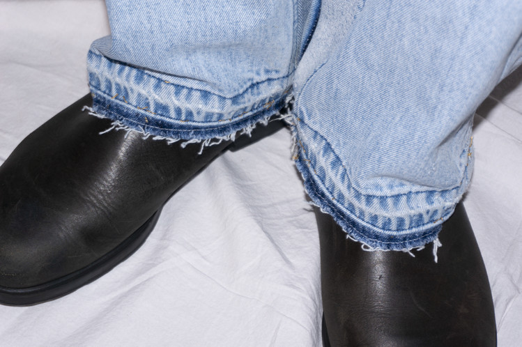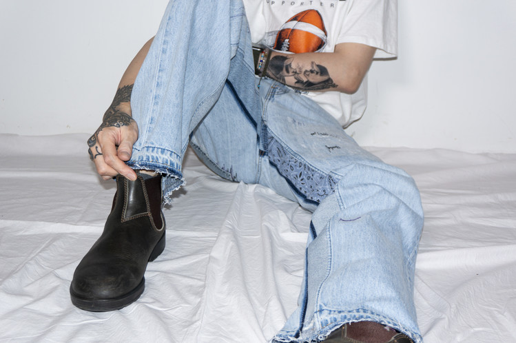 뒷주머니는 겹쳐 표현하여 Levis Red tab 두개를 확인할 수 있으며, 팬츠의 안심을 다른 리바이스 데님의 조각위에 데미지, 스티치 작업을 진행한 반다나 조각을 고정하여 채워 움직임과 함께 보여질 포인트이자 여유로운 실루엣을 만들어주는 역할을 합니다.