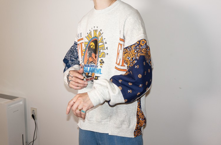East oklm, The hand remake garments로 아메리칸 빈티지 스웻셔츠들을 해체하고 재구성하여 반다나로 포인트를 만든 상품.