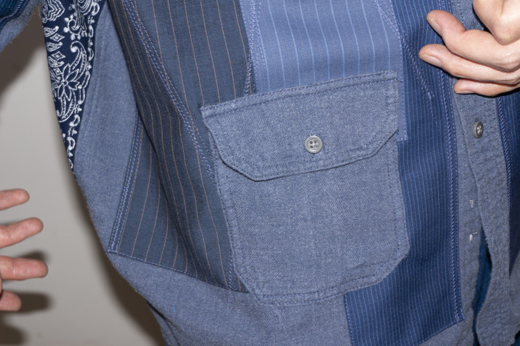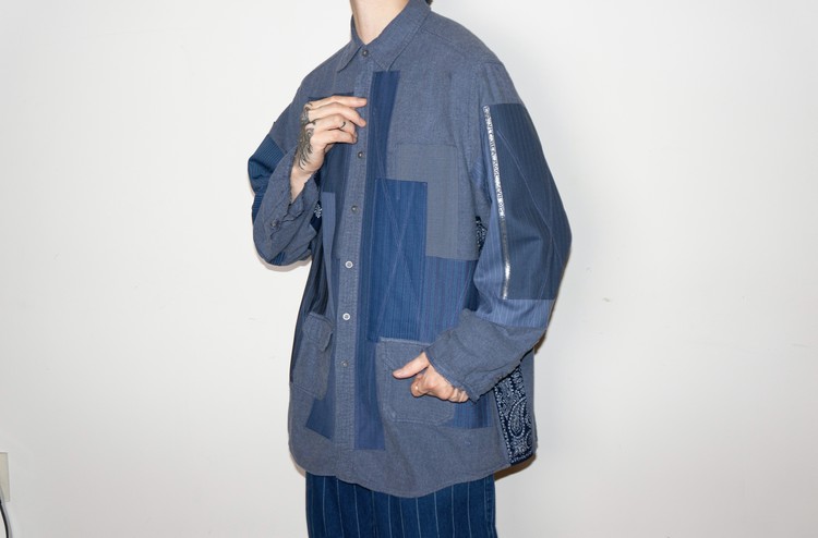 오묘한 빈티지스러운 블루 컬러감을 가진 플란넬 셔츠와 조화로울 수 있는 빈티지한 색상의 테일러 원단들을 이용하여 불규칙 하지만 정돈된 형태의 조화로운 패치워크를 확인 할 수 있으며, 왼쪽 팔소매에는 테일러 원단의 혼용률과 출처가 나와 있는 리미지 파트를 사용한 좋은 포인트를 볼 수 있습니다.