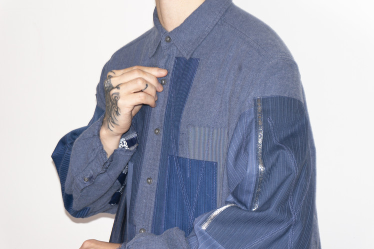 소매 끝단의 커프스는 제거하여 리메이크의 표현을 더욱 부각 시켰고, 패치워크 되어진 원단 위로 한번더 지나는 일자 스티치과 지그재그 스티치는 단단한 내구성의 표현이자 좋은 디테일로 자리하며(스티치 색상은 셔츠의 원단 색상과 동일한 색상을 사용, 양옆을 채운 네이비 색상의 반다나는 움직임과 함께 보여질 부분으로 보다 여유로운 실루엣의 표현을 가집니다.