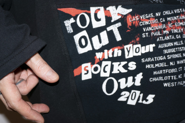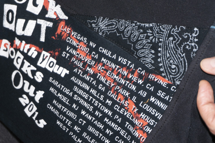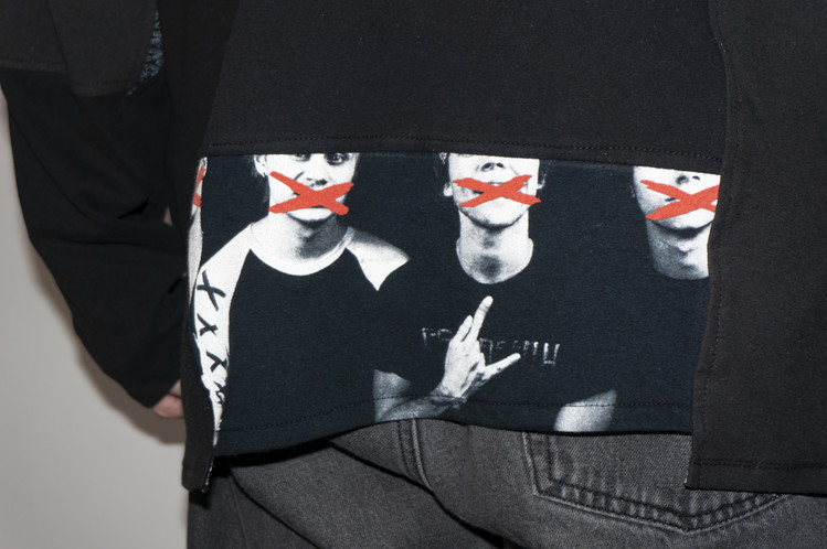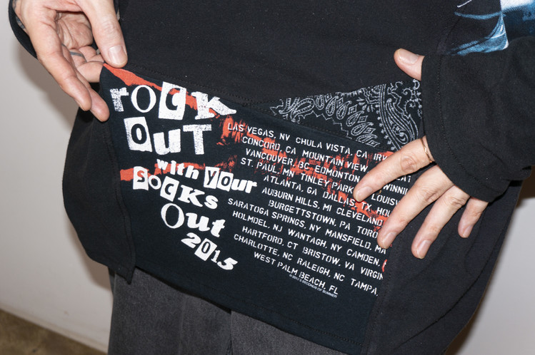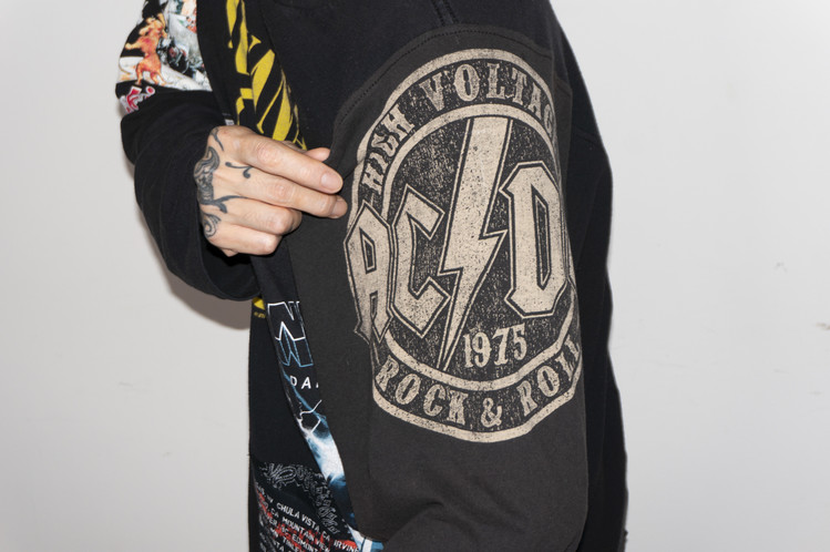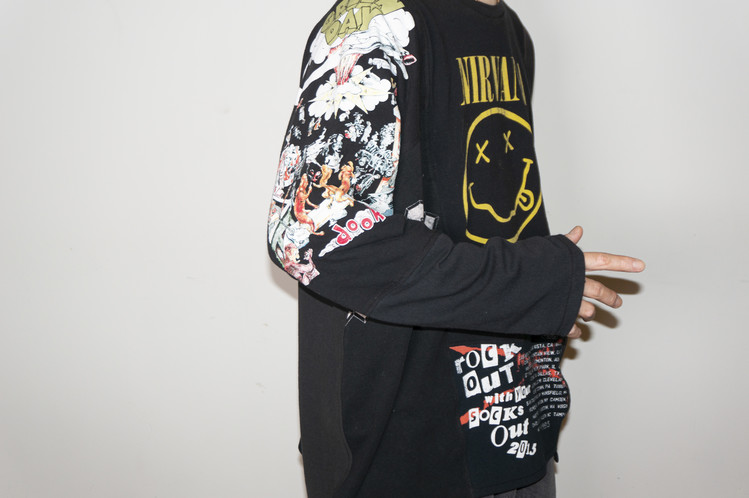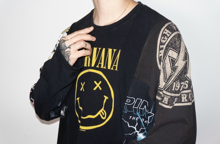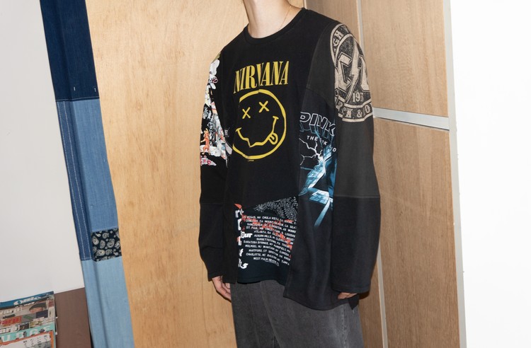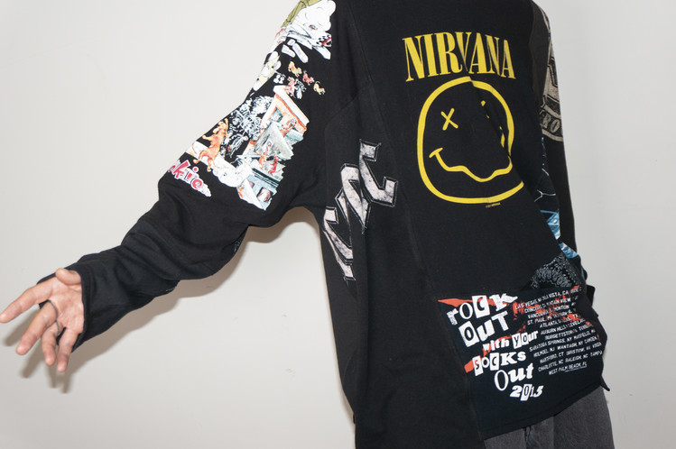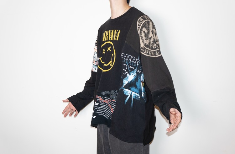 East oklm, The hand remake garments로 여러장의 Rock Band 티셔츠들을 해체하고 재구성하여 만들어진 믹스 Long Sleeve 티셔츠 상품.
