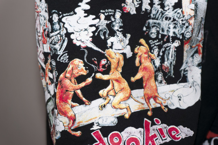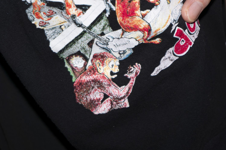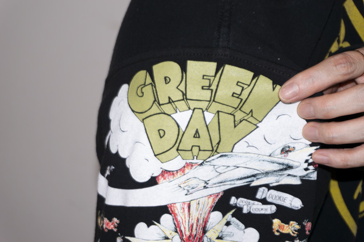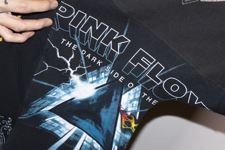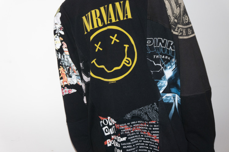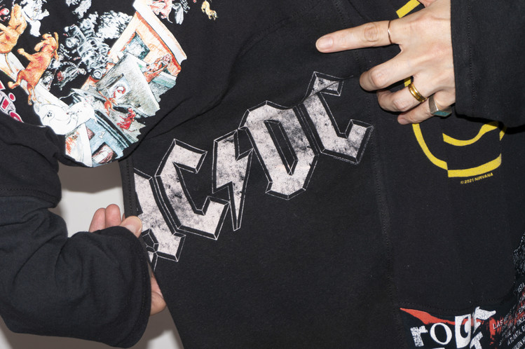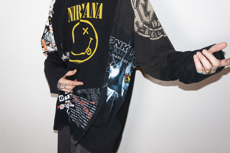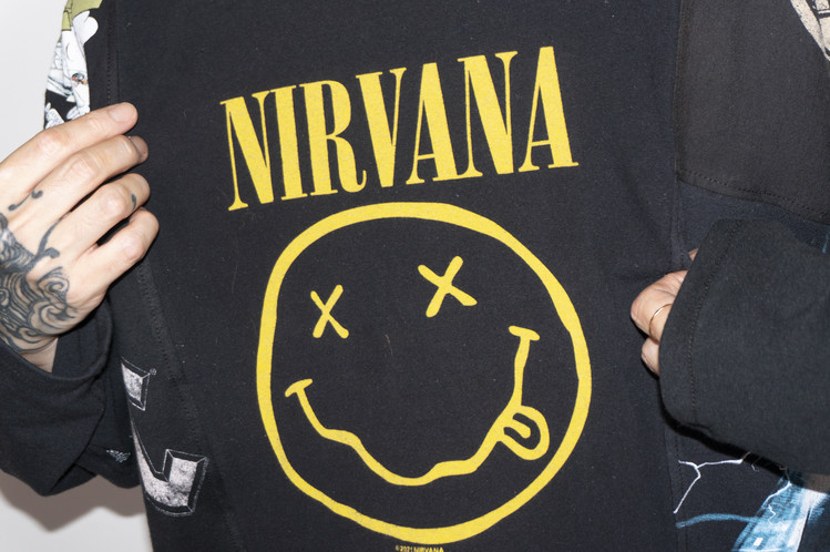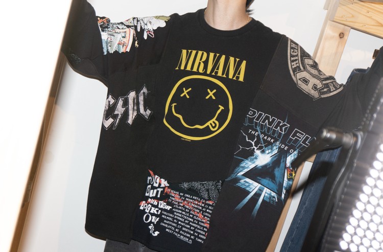 Nirvana의 상징적인 Smiley 프린팅을 볼 수 있는 티셔츠를 중심으로 ACDC, Pink Floyd, Green Day 등의 레트로한 밴드 프린팅 티셔츠들의 조각으로 구성된 모습을 볼 수 있으며, 전체적으로 블랙 색상의 티셔츠들을 사용하여 안정감있는 구성을 확인할 수 있습니다.