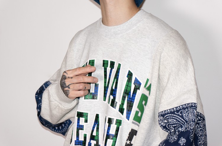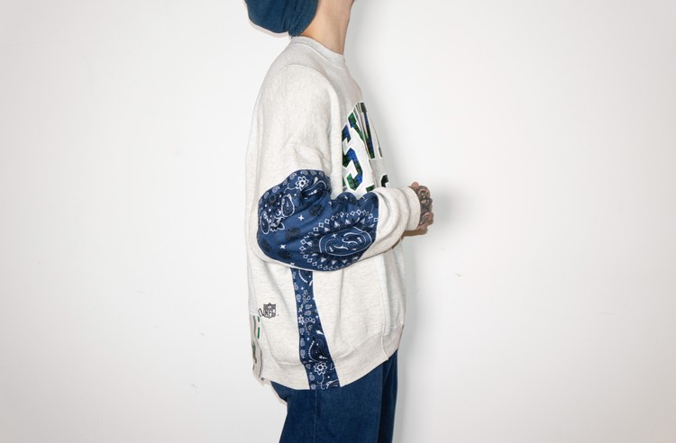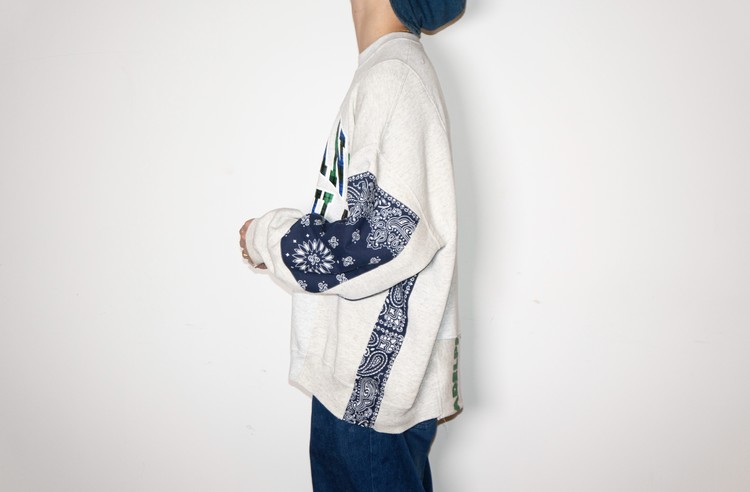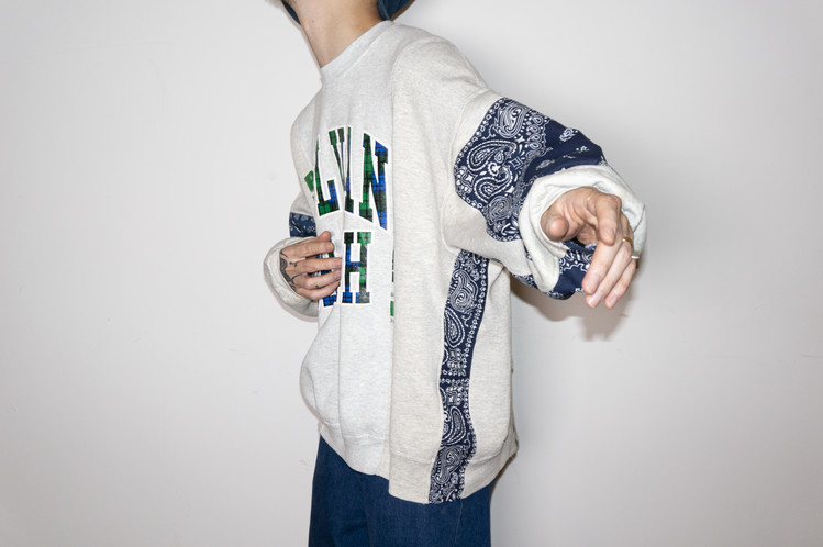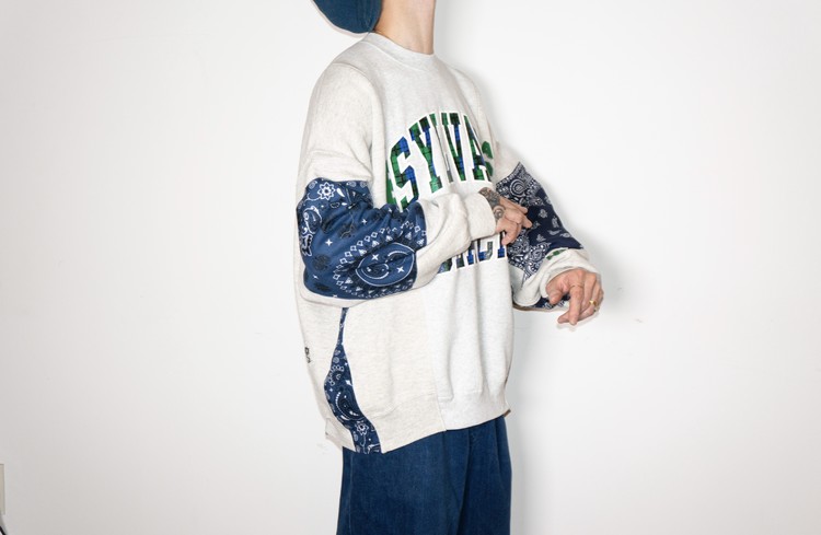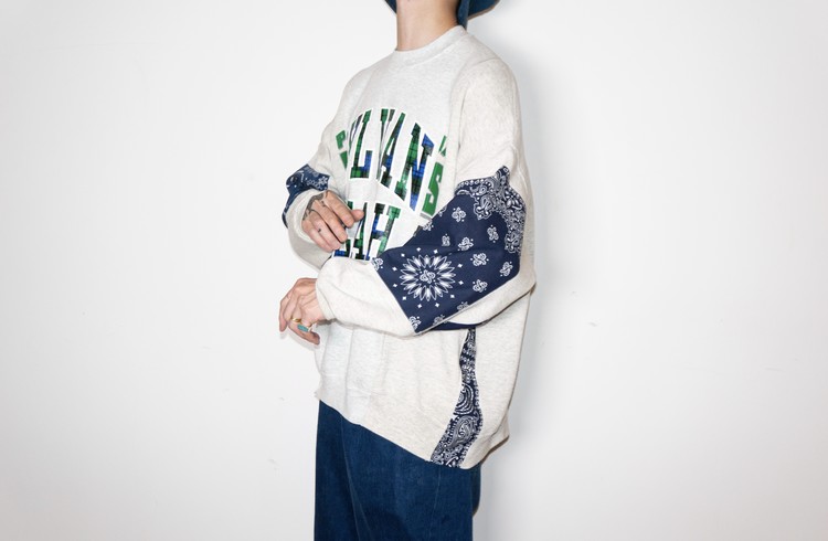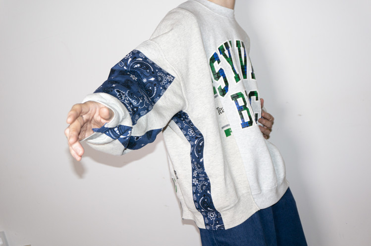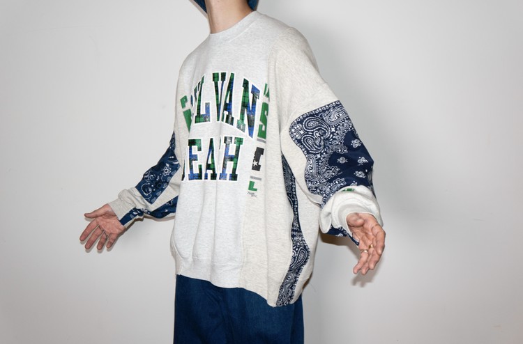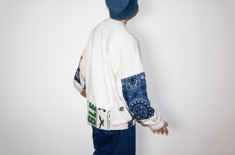 East oklm, The hand remake garments로 아메리칸 빈티지 스웻셔츠들을 해체하고 재구성하여 반다나로 포인트를 만든 상품.