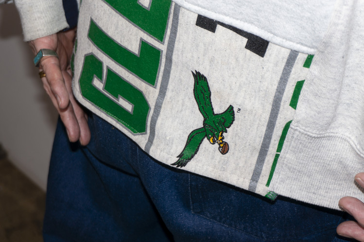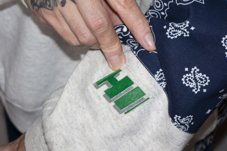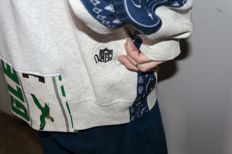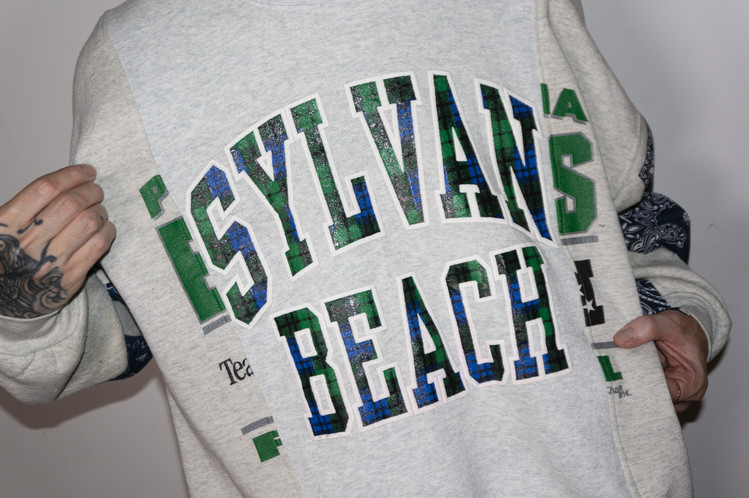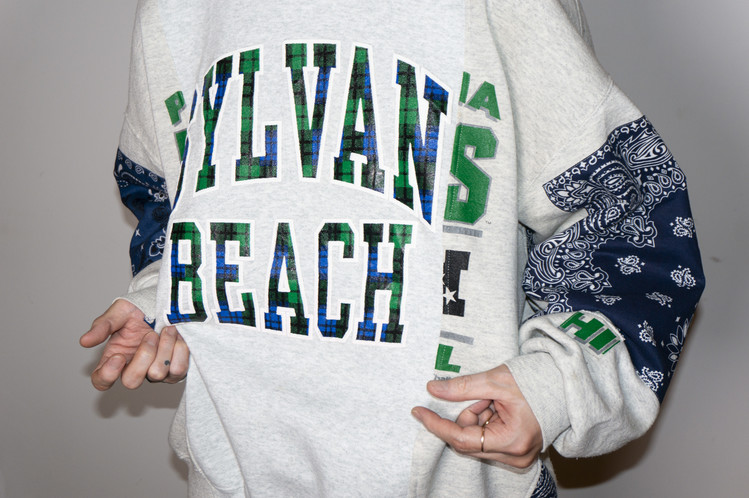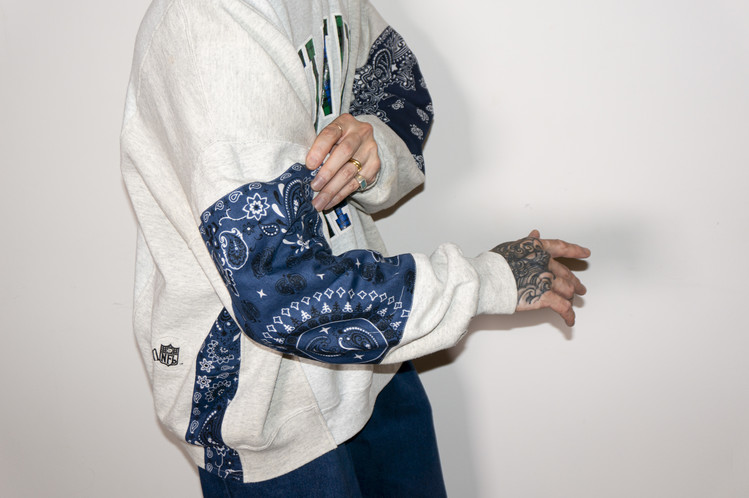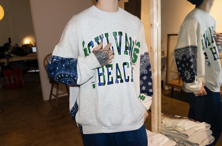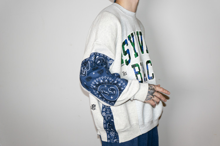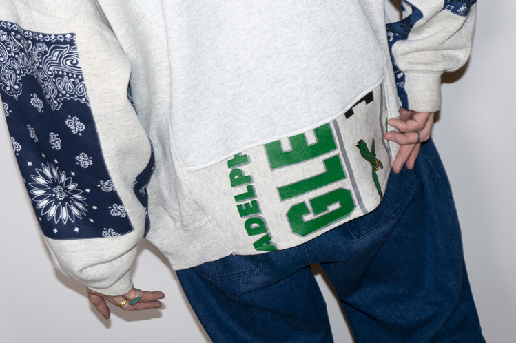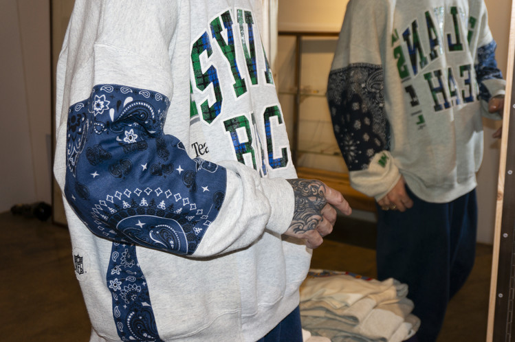 East oklm, The hand remake garments로 아메리칸 빈티지 스웻셔츠들을 해체하고 재구성하여 반다나로 포인트를 만든 상품.