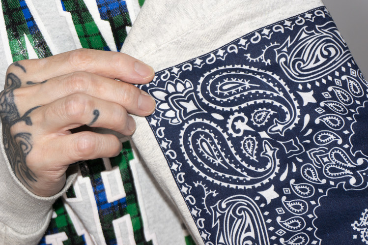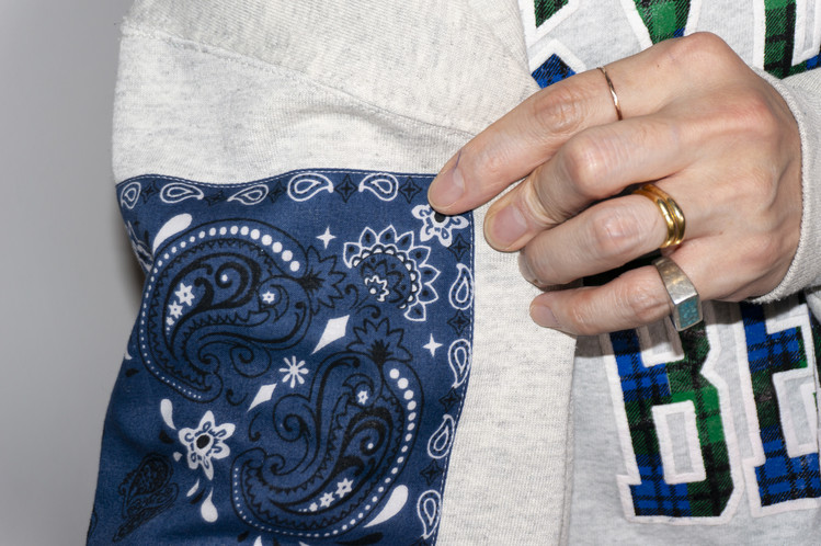 양쪽 소매부분은 네이비 색상의 아메리칸 빈티지 반다나들을 이용하여 넓게 패치워크 하고, 옷의 옆을 채워 움직임과 함께 보여질 포인트를 확인할 수 있으며, 서로 다른 문양과 적절한 색상 톤의 차이를 가집니다.