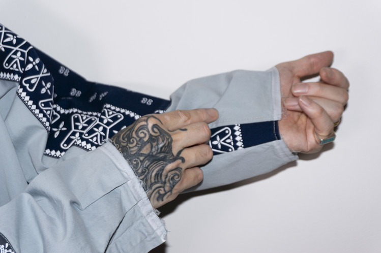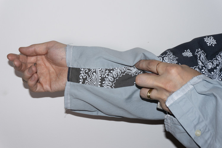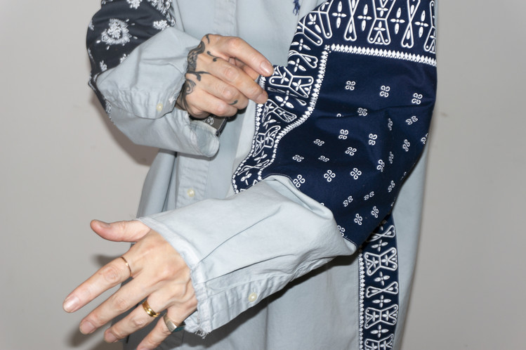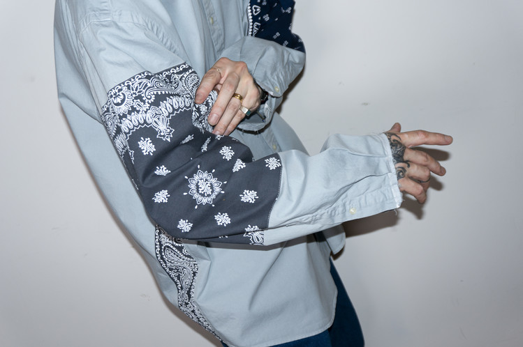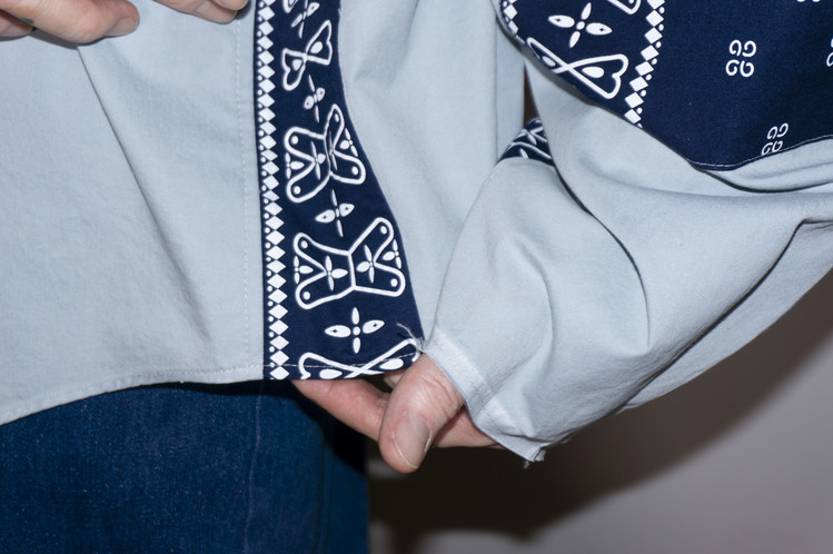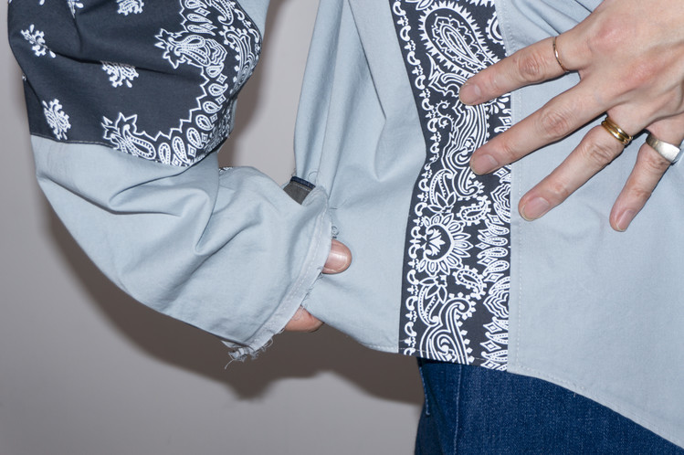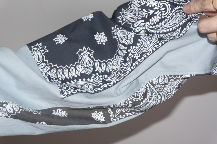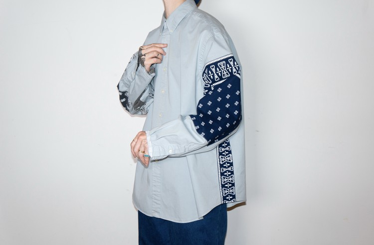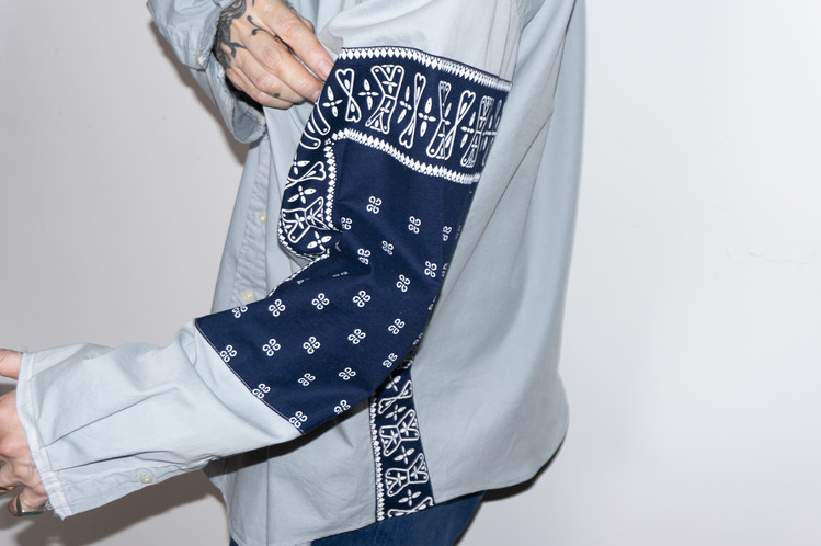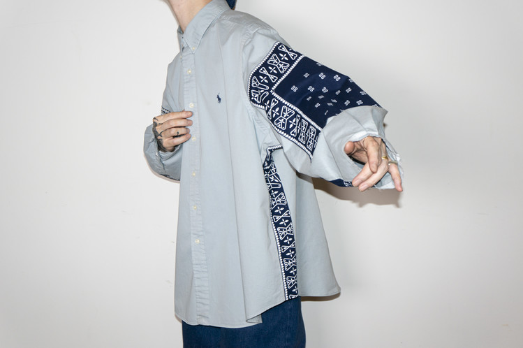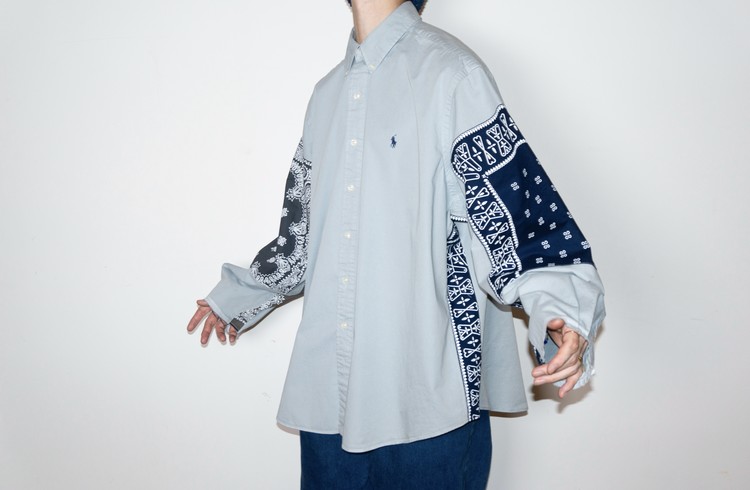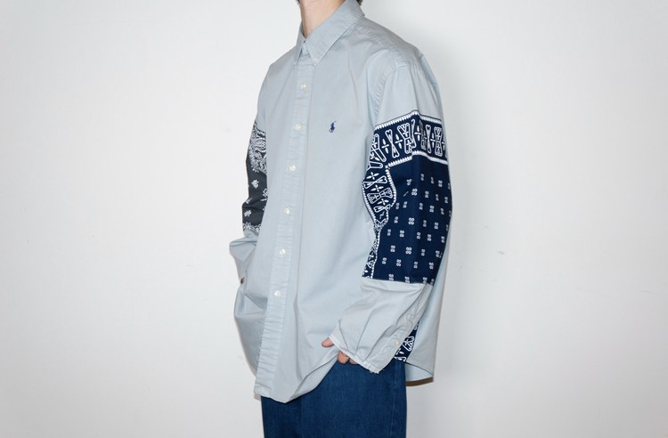 연하늘 색상이 매력적인 빅사이즈의 Polo Ralph Lauren 셔츠의 양쪽 소매에 네이비 색상과 탈색 작업을 통해 만들어진 짙은 그레이 색상의 반다나로 넓게 패치워크 되어진 구성과 옆을 채운 모양을 볼 수 있으며, 문양이 다른 반다나를 사용하여 표현 되었습니다.