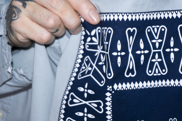 오른쪽의 옆을 채운 반다나는 컬러 페이드 작업을 통해 더욱 옅어진 컬러감을 볼 수 있으며, 옆을 채운 반다나들은 움직임과 함께 보여질 포인트이자 여유로운 실루엣의 표현을 더해줍니다.