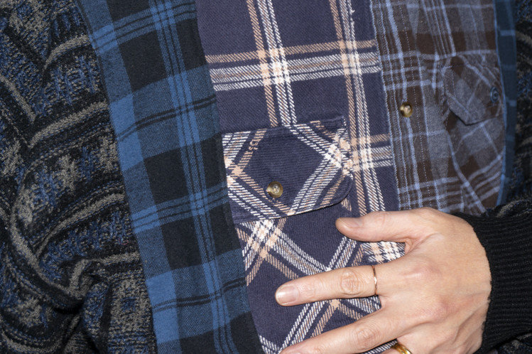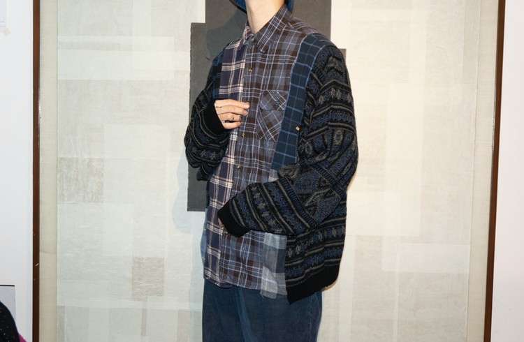 East oklm, The hand remake garments로 플란넬 셔츠들과 니트를 해체하고 재구성하여 만들어진 믹스 셔츠 상품.