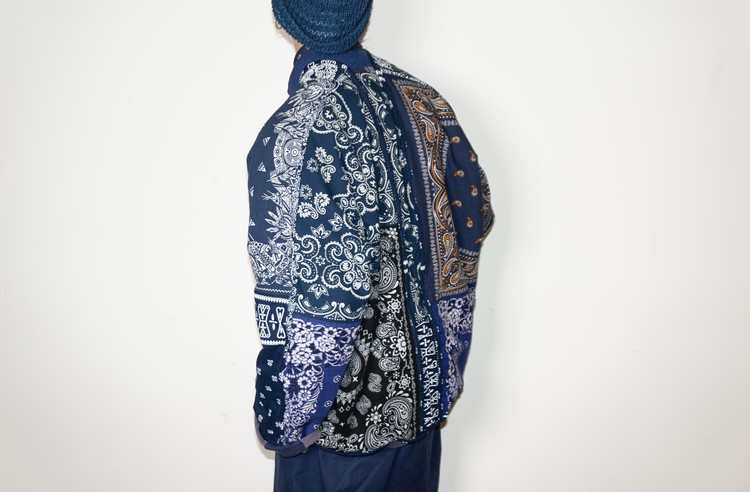 안쪽은 Fast color 반다나의 조각들로 구성하고, 주로 네이비, 블랙 색상의 톤을 사용하여 전체적인 균형감을 맞춰 주었으며, 마감부분을 반다나로 감싸 표현한 부분으로 완성도를 높였습니다.