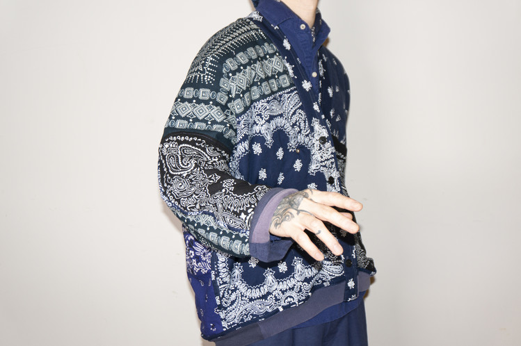 East oklm, The hand remake garments로 여러장의 스웻셔츠들과 반다나를 활용하여 만들어진, 뒤집어 입을 수 있는 가디건 아우터 상품.