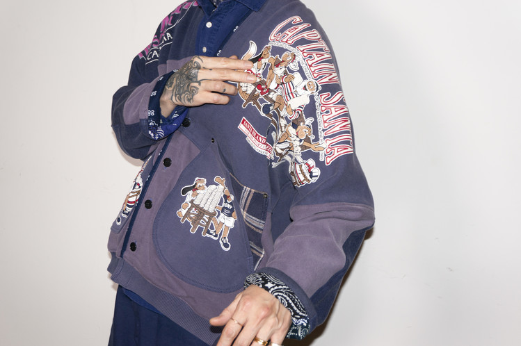 빈티지한 컬러감과 귀여운 캐릭터의 프린팅이 인상적인 Captain Santa 스웻셔츠의 조각들과 Adidas 스웻셔츠의 자수가 위치한 조각, 빈티지 아메리칸 스웻셔츠들의 조각들로 믹스된 구성을 볼 수 있으며, 앞판의 포켓들 또한 귀여운 캐릭터 프린팅 조각들로 만들어 졌습니다.