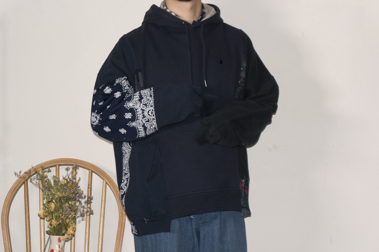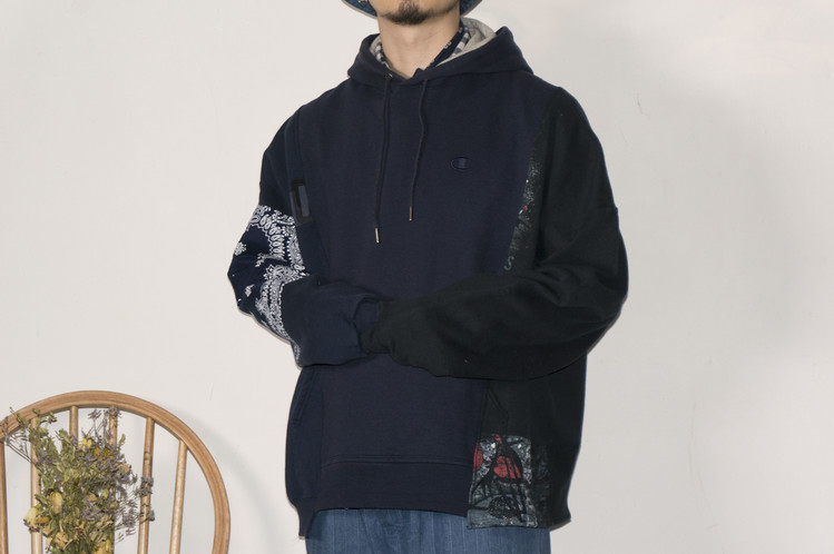 East oklm, The hand remake garments로 navy 색상의 챔피온 후드를 중심으로 양옆을 스웻셔츠와 함께 믹스한 상품. 중앙의 후디는 챔피온 로고의 자수를 볼 수 있으며, 양옆은 블랙색상과 네이비 색상의 스웻셔츠를 이용하여 만들어져 전체적으로 톤이 비슷하게 맞추어 졌습니다.