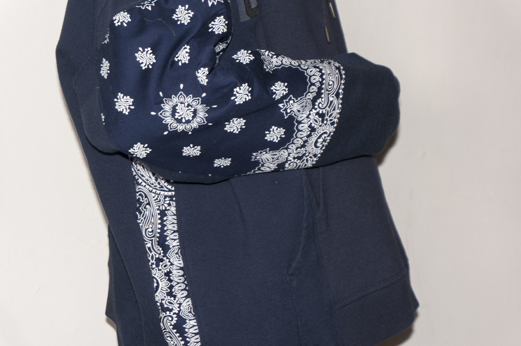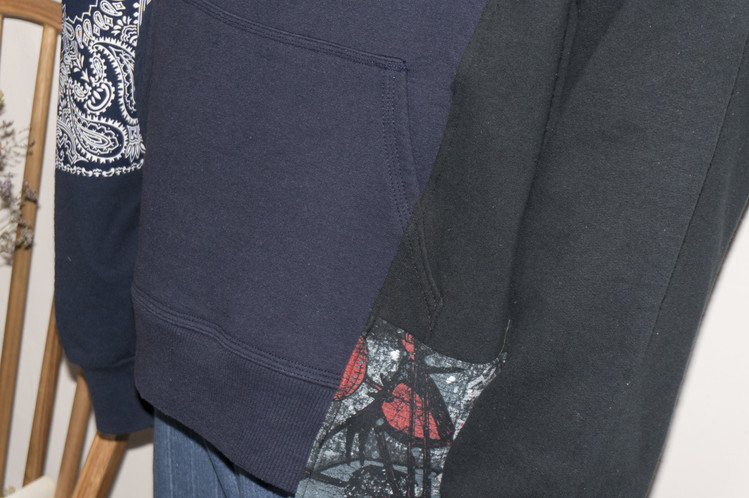 왼쪽의 블랙색상 아래부분은 스웻의 가운데 프린트 부분으로 새로운 포인트를 만들었고, 오른쪽은 네이비색의 반다나를 이용하여 소매에 패치워크하고 옆을 채웠습니다. 서로의 길이가 다른 표현은 리메이크 제품의 재미있는 부분으로 자리하고 있어 좋은 표현으로 자리하고 있습니다.