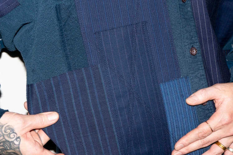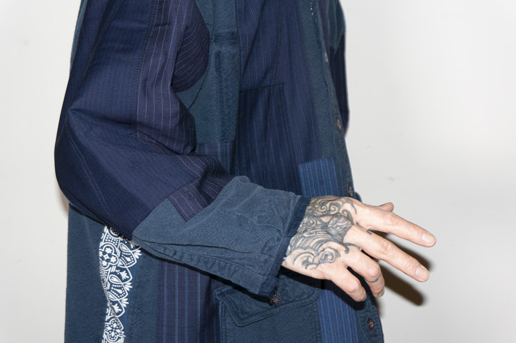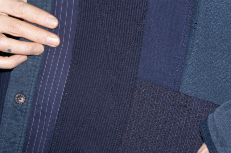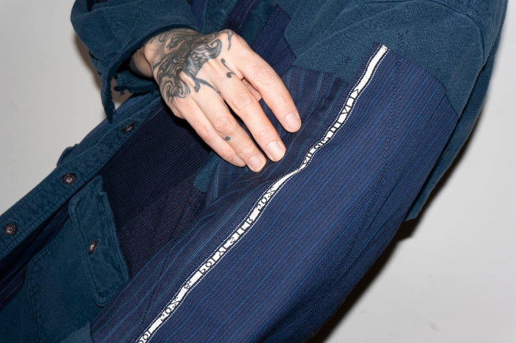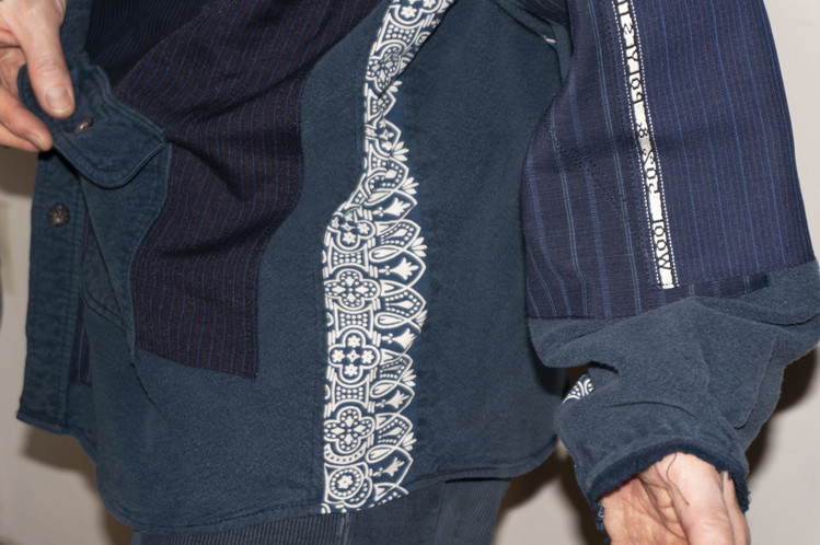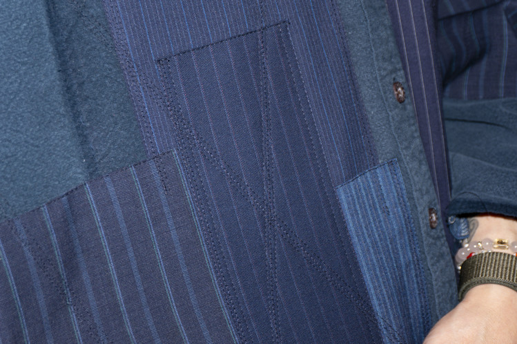 주로 짙은 네이비 색상의 테일러 원단들을 이용하여 불규칙하나 정돈된 형태의 조화로운 패치워크를 확인할 수 있으며, 왼쪽 소매에는 테일러 원단의 혼용률과 출처가 나와 있는 리미지 파트를 사용하여 보다 좋은 포인트를 주었습니다.