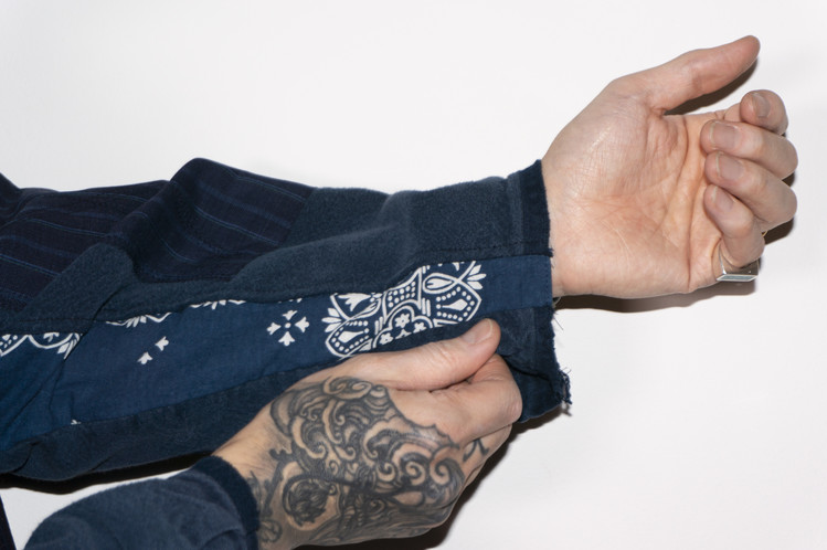 패치워크 되어진 테일러 원단 위로 한번더 지나는 일자 스티치와 지그재그 스티치는 단단한 내구성의 표현이자, 좋은 디테일로 자리하며, 양옆을 채운 반다나는 Fast color 네이비 색상의 반다나로 채워 움직임과 함께 보여질 부분으로 볼 수 있습니다.