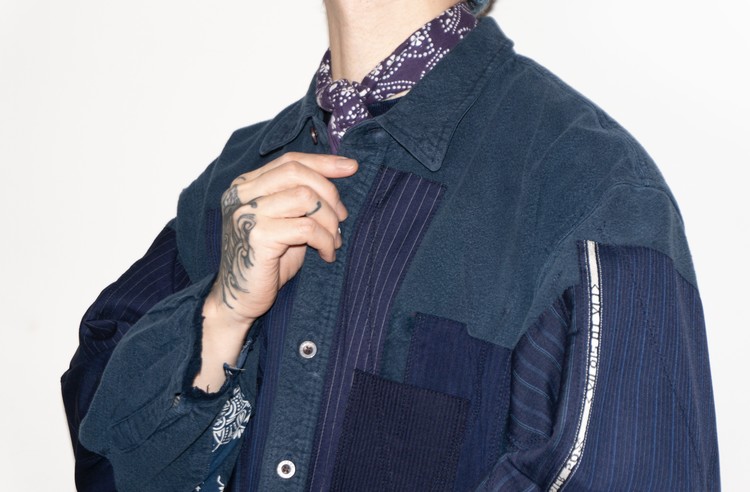 East oklm, The hand remake garments로 빈티지한 네이비 색상이 인상적인, 두께감있는 단단한 짜임의 면 원단 셔츠에 테일러 원단을 패치워크하고, 반다나로 옆을 채운 셔츠 상품.