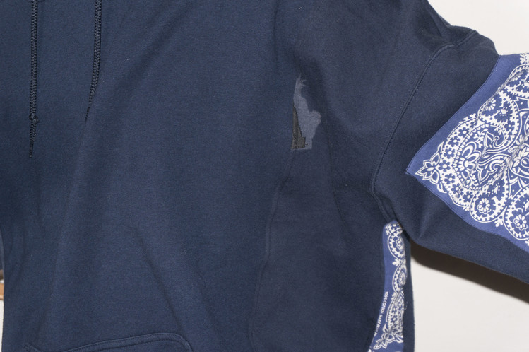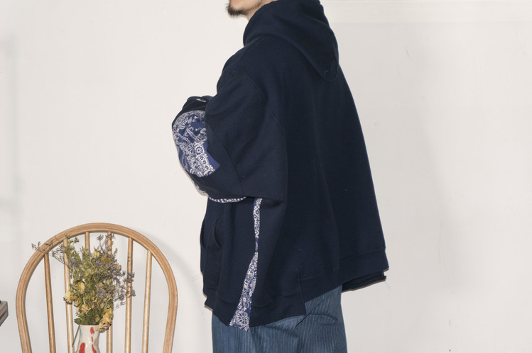 빅사이즈의 오버핏으로 만들어져 여유로운 실루엣을 즐길 수 있는 이 제품은, 왼쪽의 소매아래 챔피온의 로고자수와 빛바랜 네이비색의 반다나를 이용하여 패치워크 되어졌고, 옆을 반다나로 채워 양옆의 폭을 균형있게 만들었습니다.