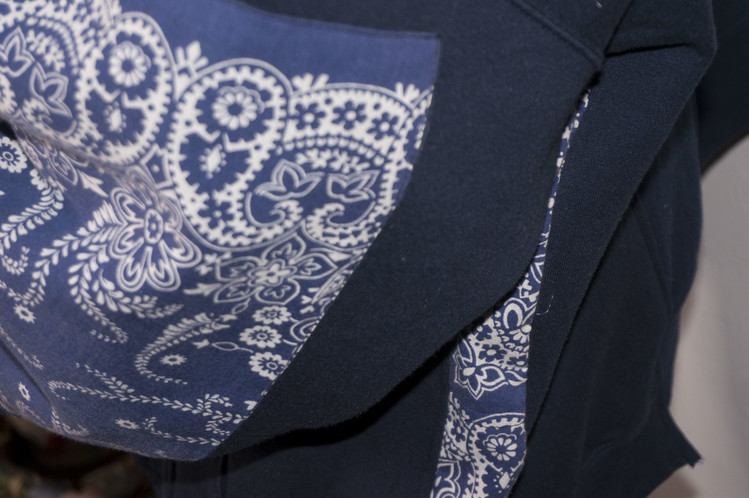 East oklm, The hand remake garments로 여러장의 후디와 스웻셔츠를 믹스하고, 반다나를 이용하여 표현되어진 상품. 중앙의 네이비 색상의 후디를 중심으로 같은 톤의 제품들을 믹스하여 전체적인 균형이 맞추어진 옷 입니다.
