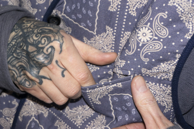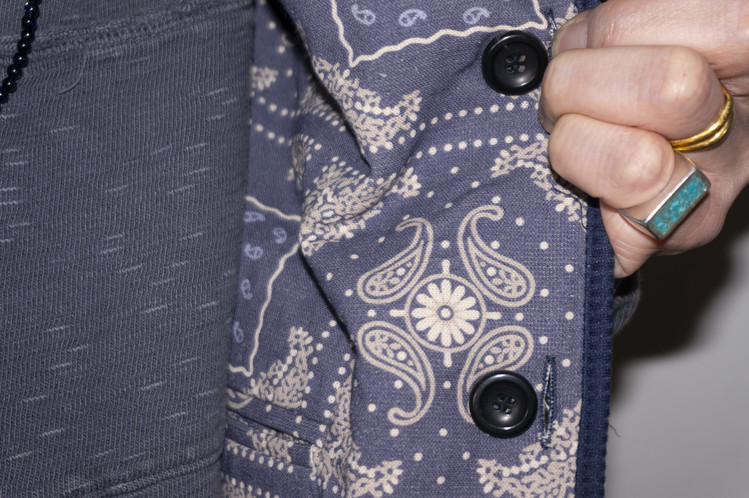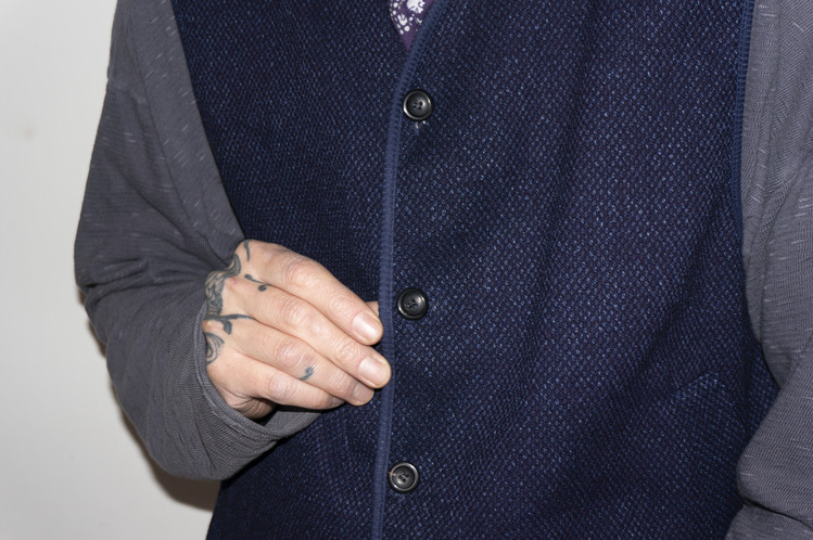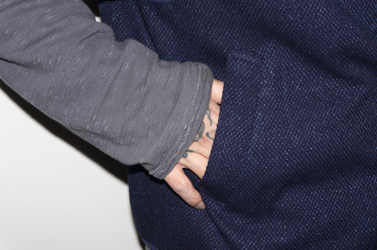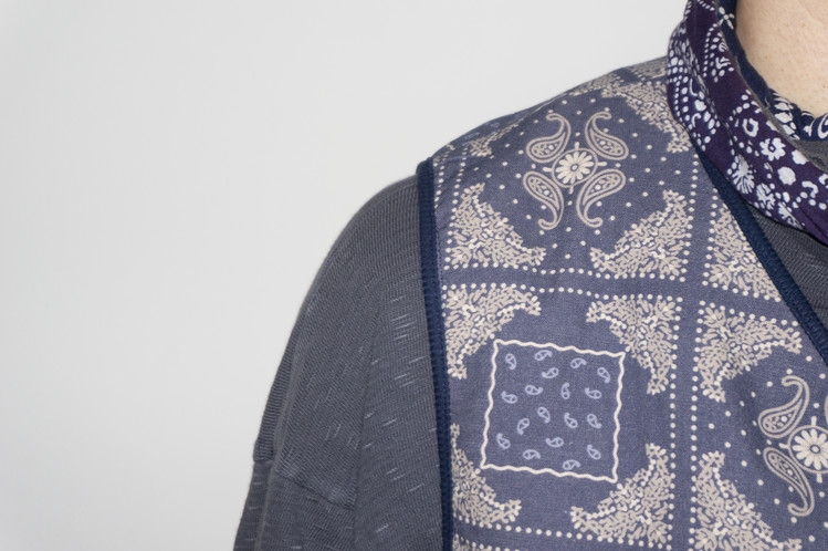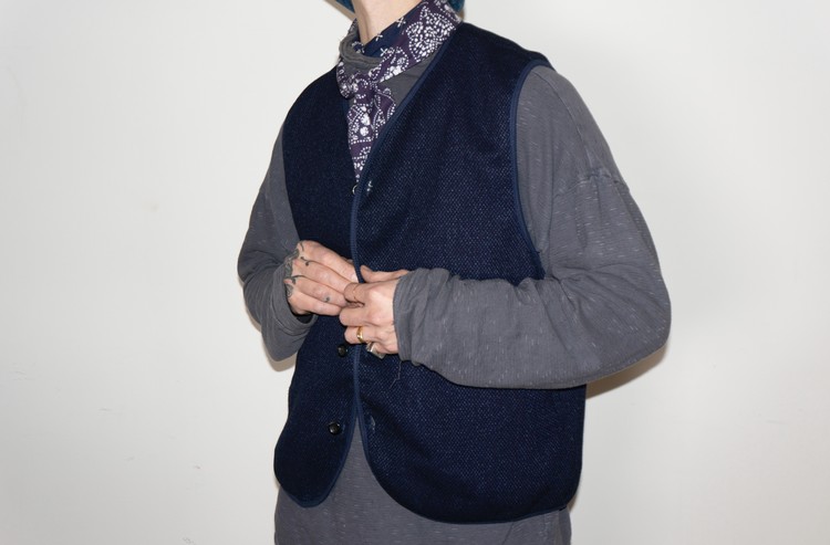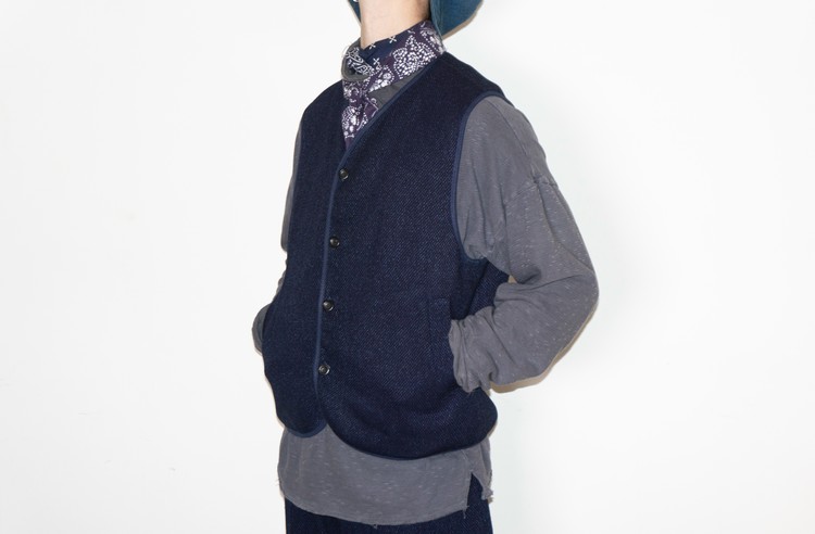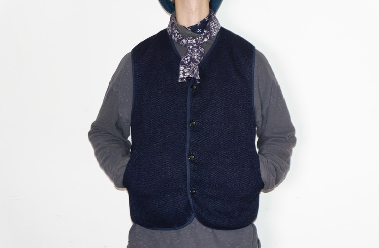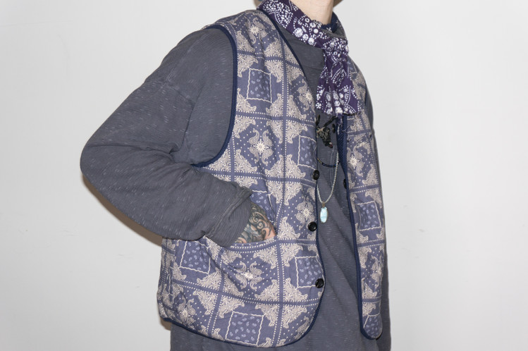 East oklm, Collection for Go East 의 제품으로 앞면은 사시코(Sashiko)를 오마주 하여 제작된 원단으로 인디고 다잉(Indigo dyeing) 이후 One wash를 한 컬러로 만들어졌으며, 뒷면은 빈티지한 네이비 색상의 페이즐리 문양 원단으로 완성된 Reversible Vest.