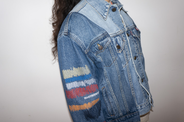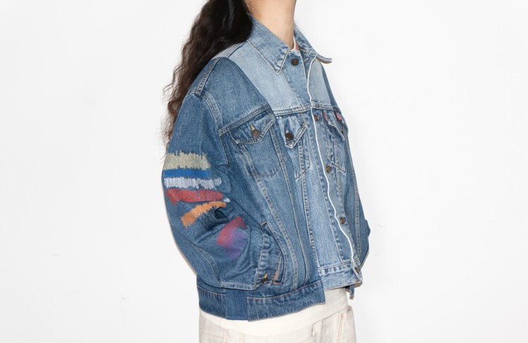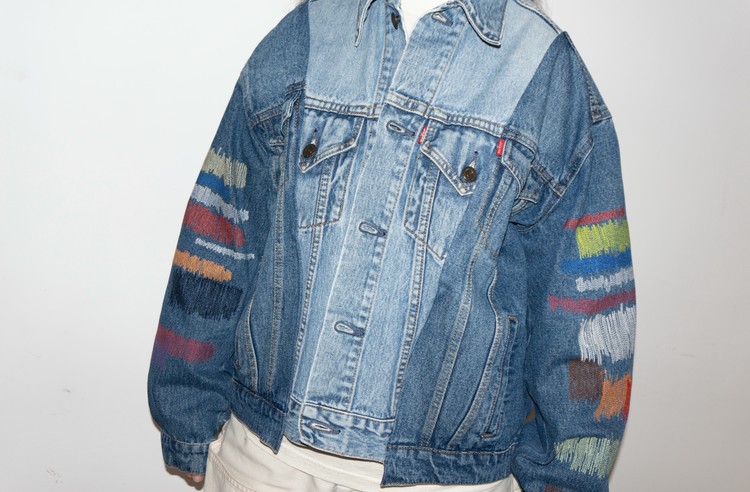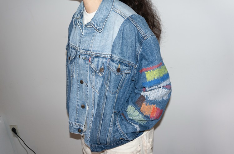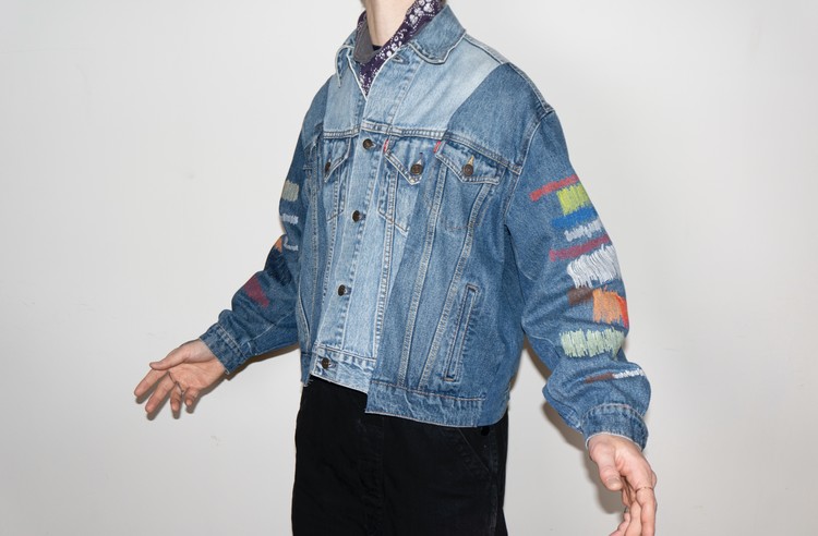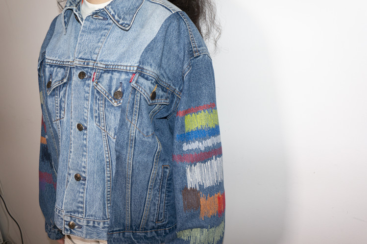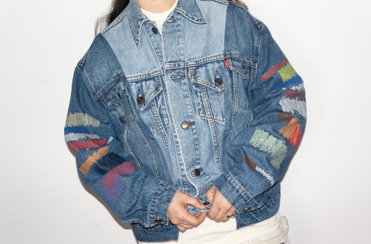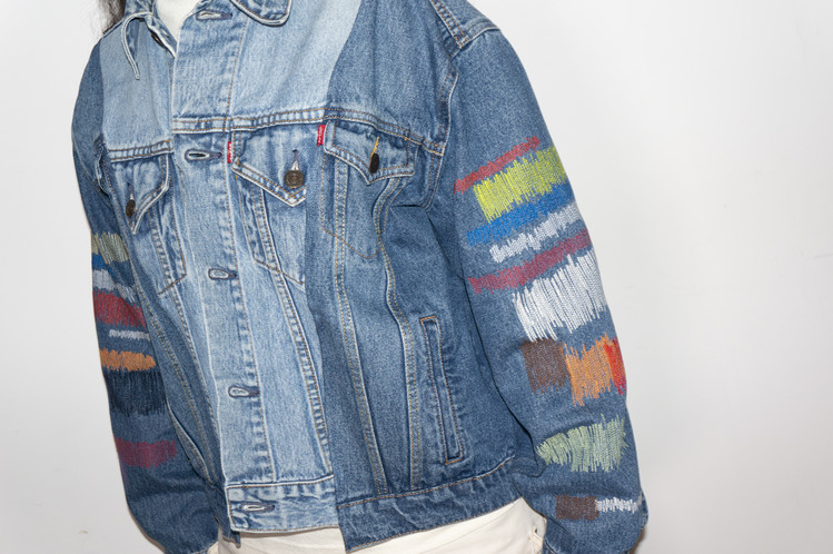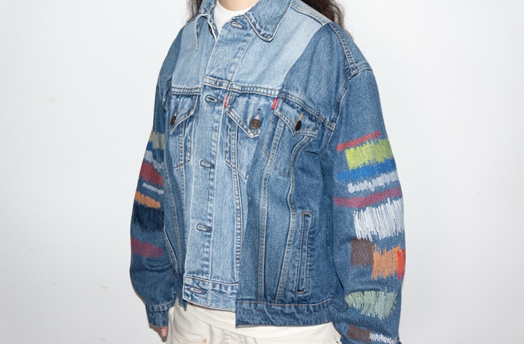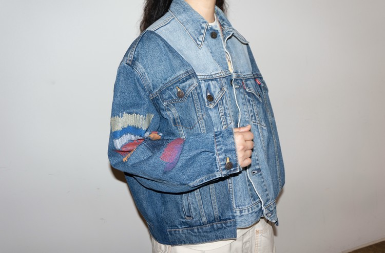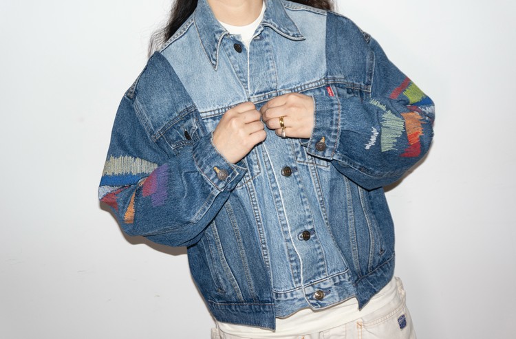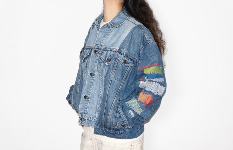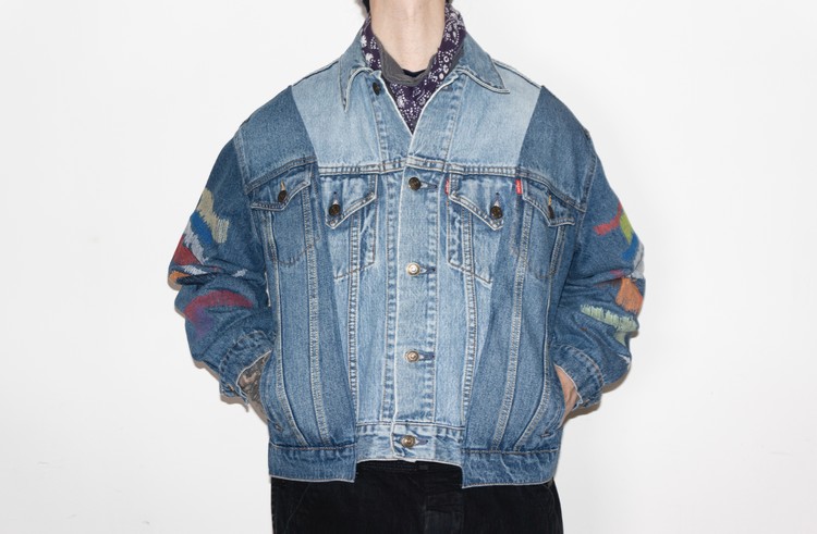 East oklm, The hand remake denim으로 서로 다른 Levis 데님 자켓들을 해체하고 재구성하여, 인디언을 연상하게 하는 다양한 색상의 실로 색칠을 한듯 스티치 작업을 더해 완성된 리메이크 자켓 상품.