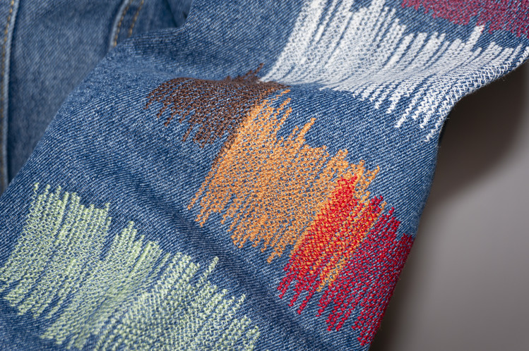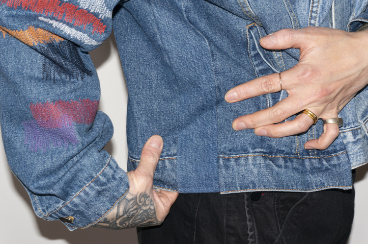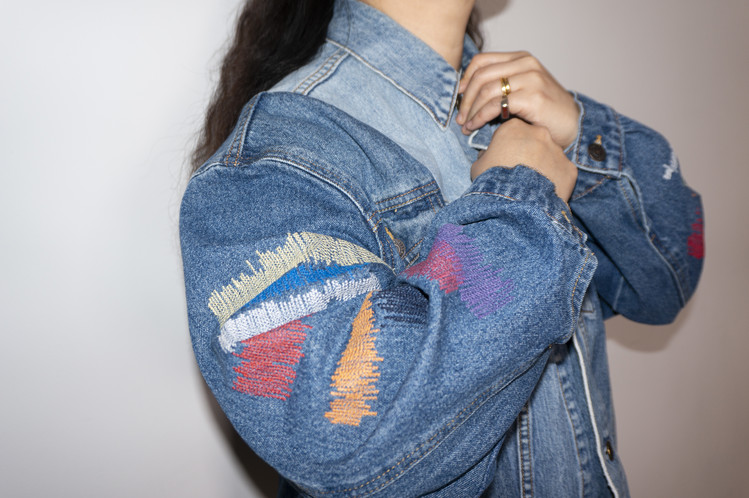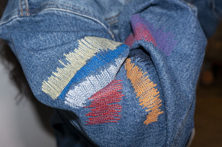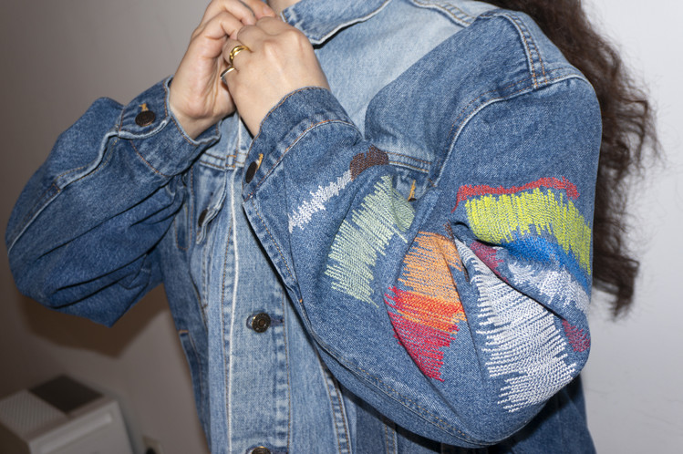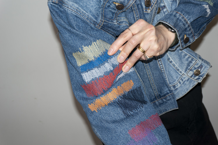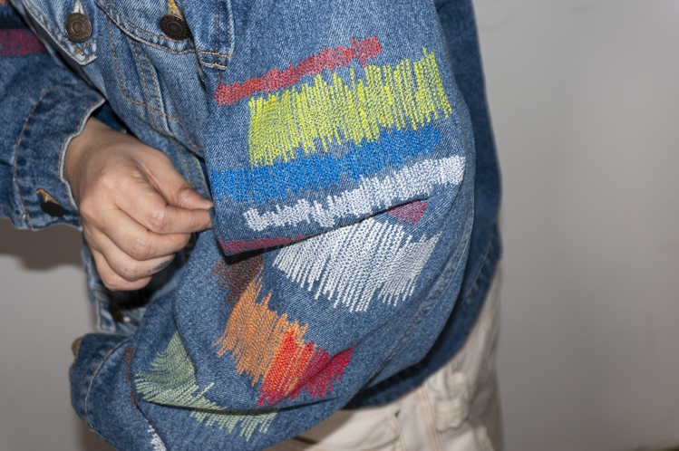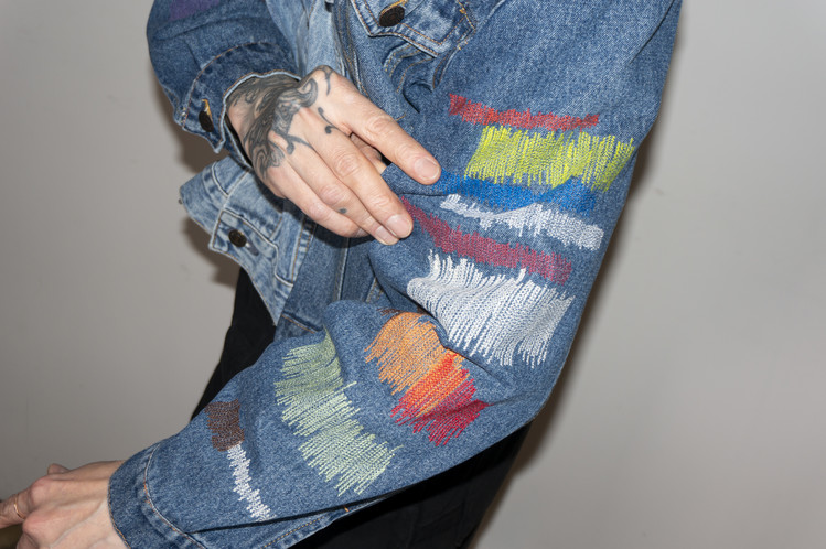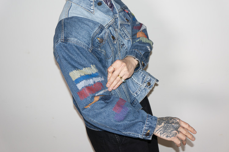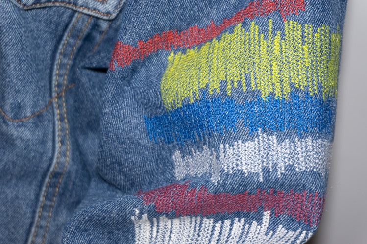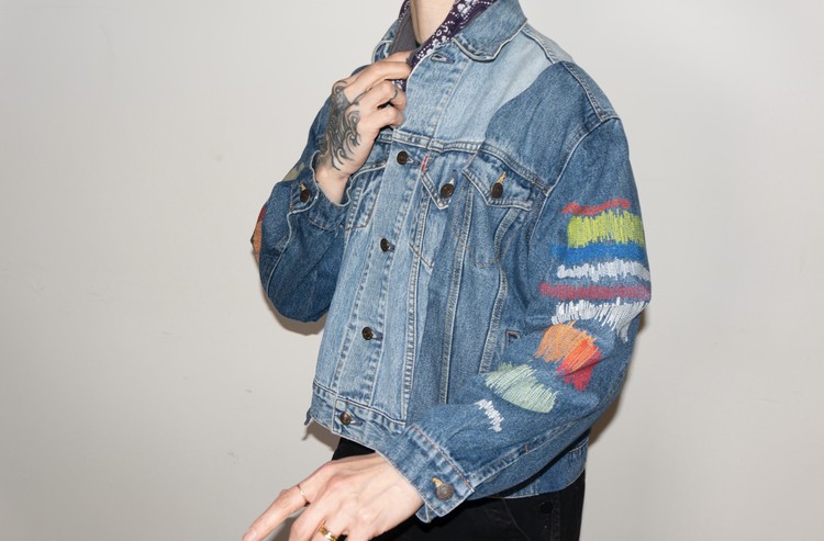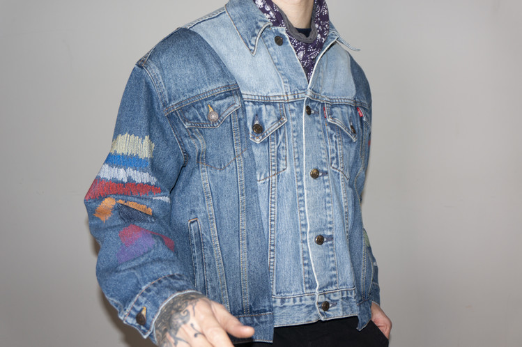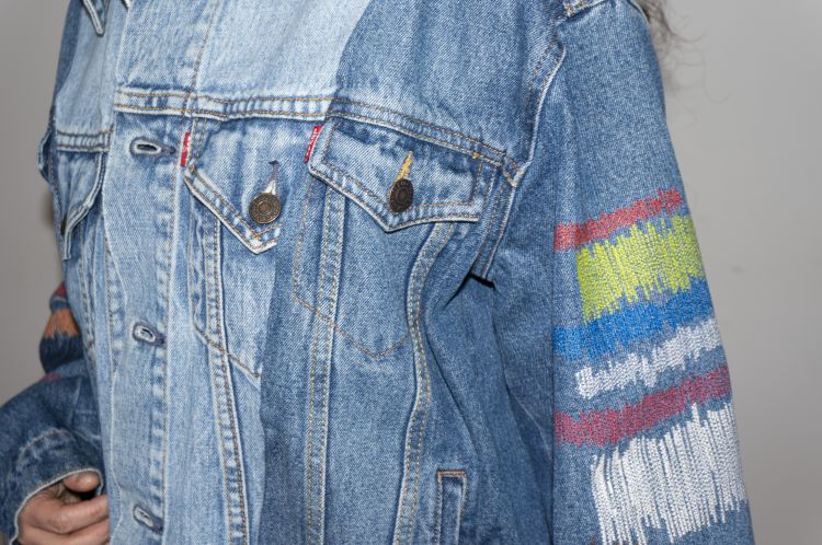 East oklm, The hand remake denim으로 서로 다른 Levis 데님 자켓들을 해체하고 재구성하여, 인디언을 연상하게 하는 다양한 색상의 실로 색칠을 한듯 스티치 작업을 더해 완성된 리메이크 자켓 상품.