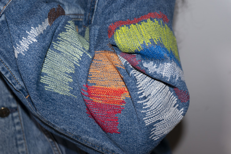 양쪽 소매에는 지그재그 스티치를 통해 다양한 색상의 실들로 색칠한듯한 표현을 볼 수 있으며, 이는 인디언을 연상하게 하는 요소 입니다.