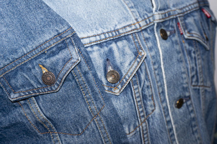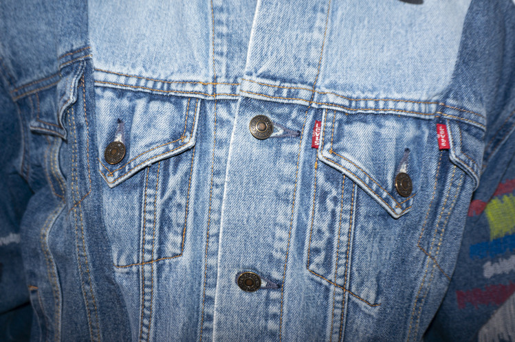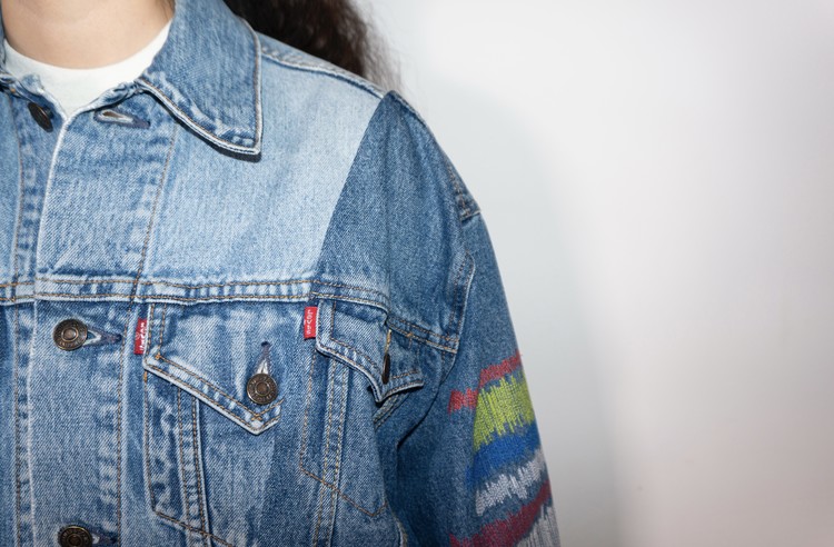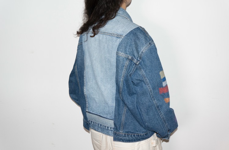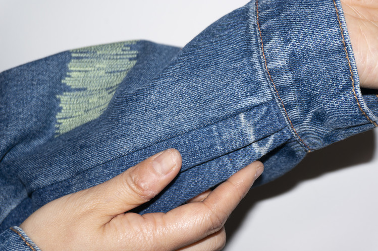 양옆은 Levis 팬츠의 조각을 연결하여 채운 구성으로 소매끝단의 너비를 넓게 잡아 커프스에 연결하여 유연한 실루엣을 보여주고, 기존의 자켓 색감과 이질감이 들지 않도록 자리 합니다.
