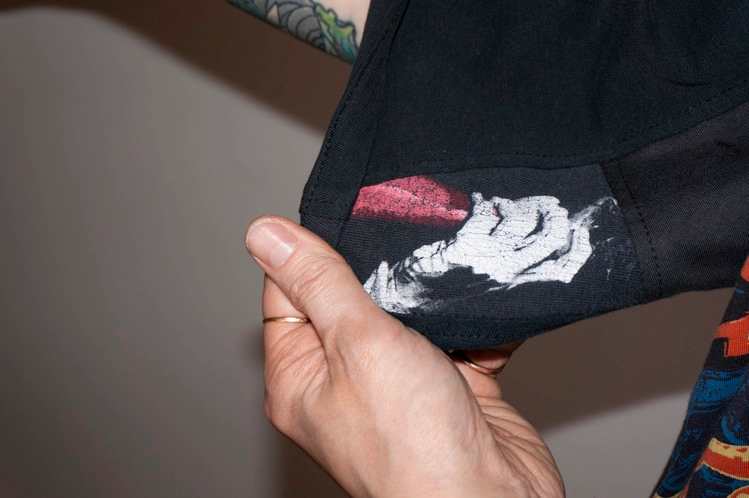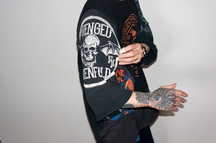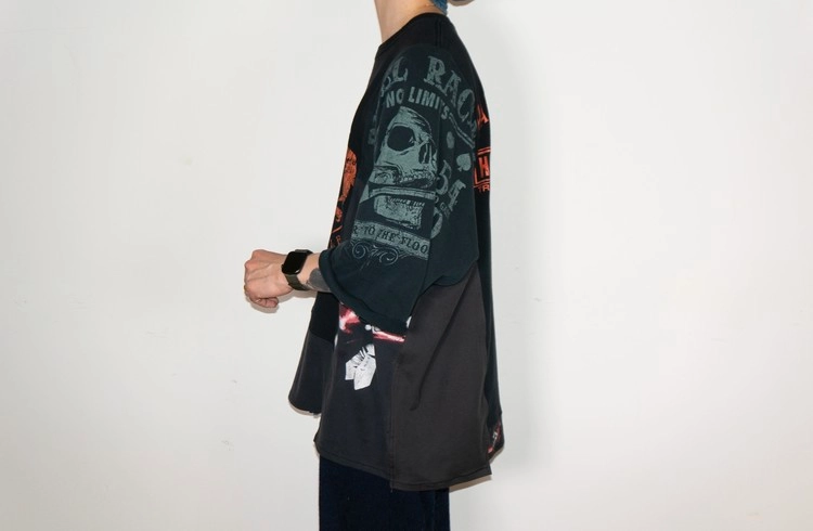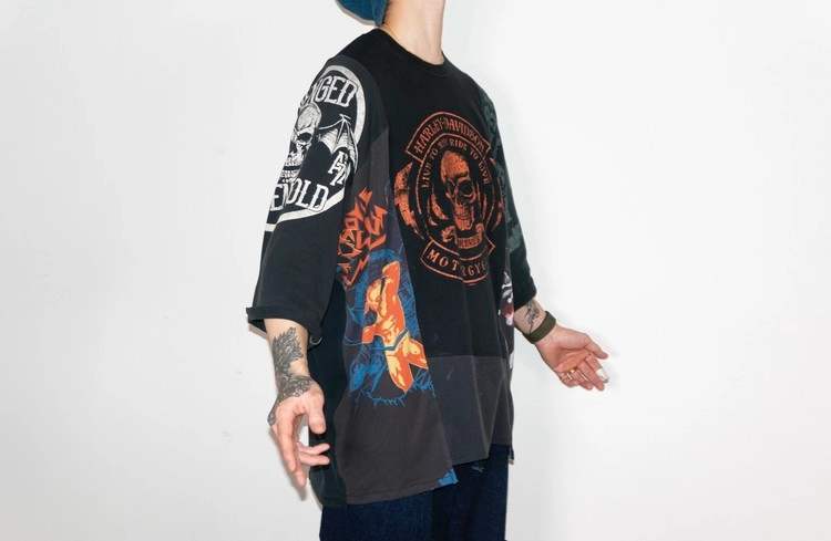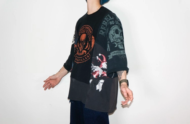 East oklm, The hand remake garmentgs로 여러장의 아메리칸 빈티지 티셔츠들을 해체하고 재구성하여 만들어진 믹스 티셔츠 상품.