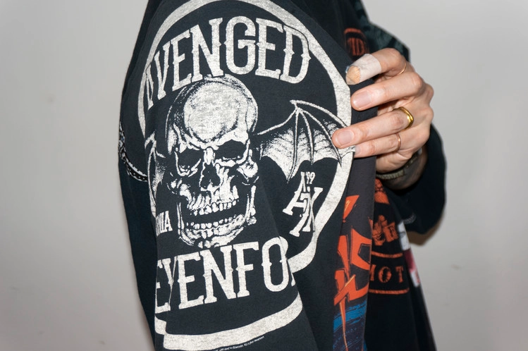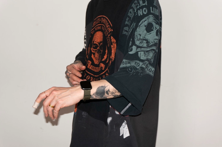 같은 블랙 색상이나 세월감의 차이를 가진 색상톤 차이를 볼 수 있으며, 앞판과 뒤판에 짙은 오렌지 색상의 강렬한 Harley Davidson의 프린팅을 가진 티셔츠를 중심으로 다양한 Skulls들의 프린팅과 조커, 할리퀸의 사실적인 프린팅의 조합을 확인할 수 있습니다.