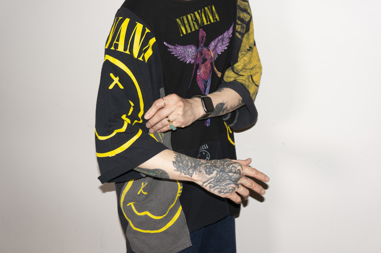 East oklm, The hand remake garments로 여러장의 빈티지 Nirvana 티셔츠들을 해체하고 재구성하여 만들어진 믹스 티셔츠 상품.
