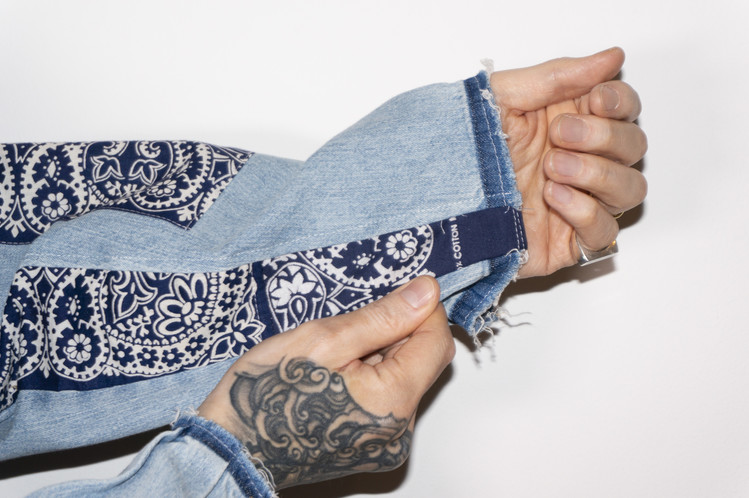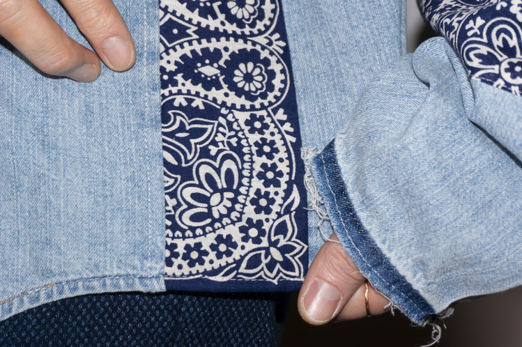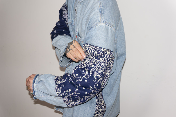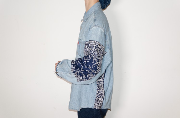연청 색상 Levis 데님 셔츠의 양쪽 소매에 적절한 세월감의 네이비 색상 빈티지 Fast color 반다나들을 사용하여 넓게 패치워크하고 옆을 채운 구성을 볼 수 있습니다.