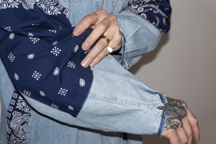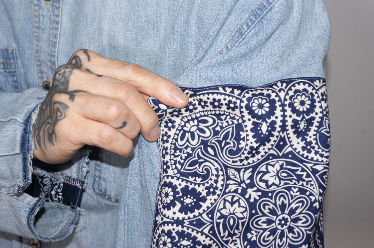 데님 셔츠의 색상과 반다나의 조화로운 색상 구성을 볼 수 있으며, 양쪽 반다나는 서로 다른 문양을 사용하여 완성 되었습니다.