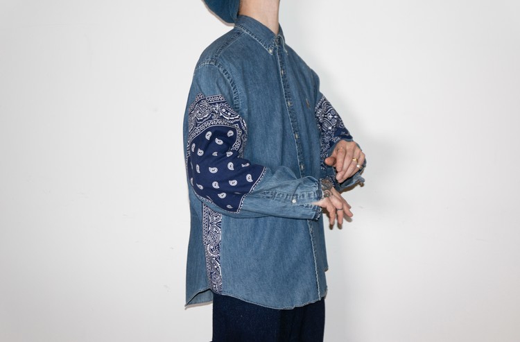 중청 색상으로 얇은 두께감의 오색말 로고가 있는 Polo Ralph Lauren 데님 셔츠의 양쪽 소매에, 적절한 세월감의 네이비 색상 빈티지 Fast color 반다나들을 이용하여 넓게 패치워크하고 옆을 채운 구성을 볼 수 있습니다.