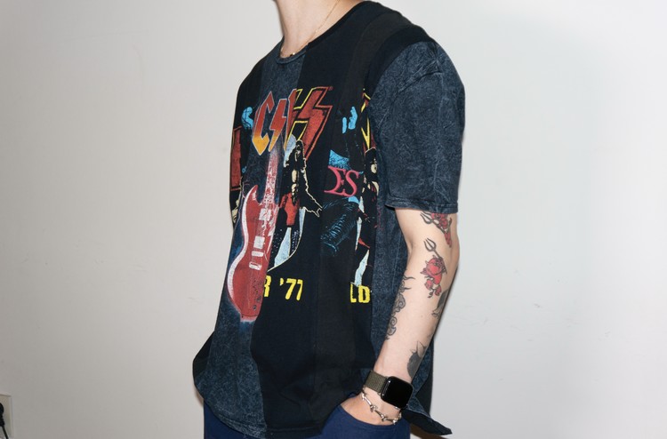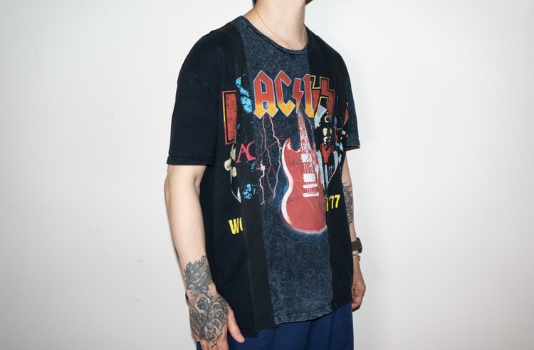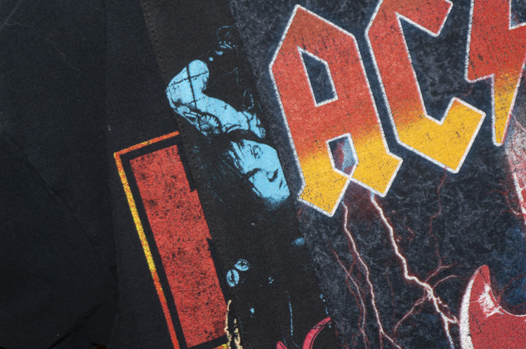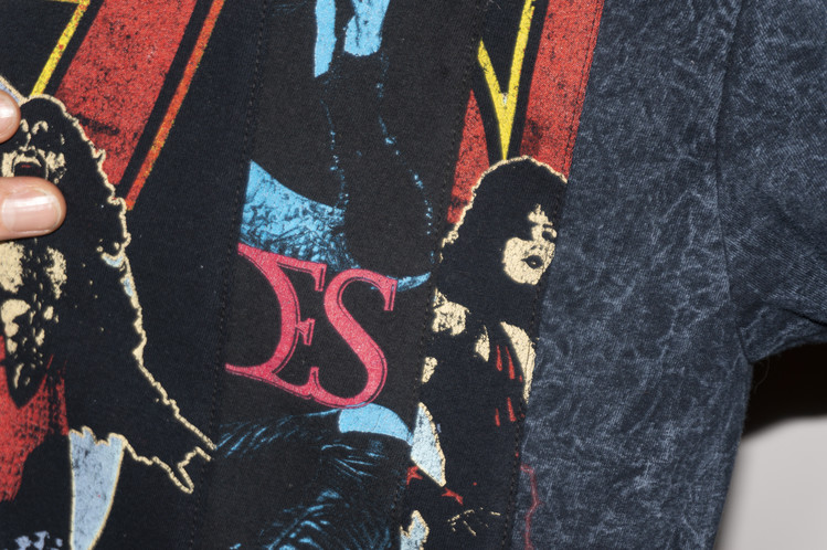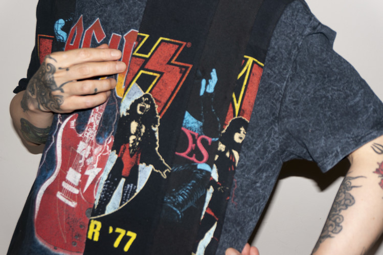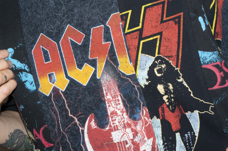 하드락 밴드인 ACDC, KISS, 그리고 이모(Emo)밴드 Black Veil Brides의 빈티지 티셔츠의 조각들로 믹스 되었으며, 양쪽에 적절한 밸런스의 차이를 두어 완성 되었습니다.