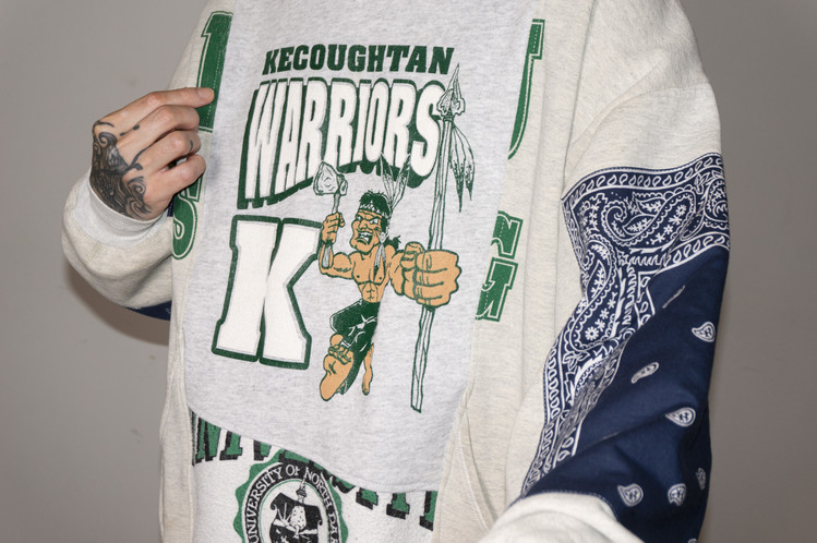 East oklm, The hand remake garments로 아메리칸 빈티지 스웻셔츠들을 해체하고 재구성하여 반다나로 포인트를 만든 상품.