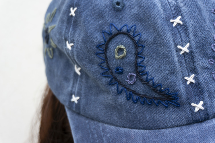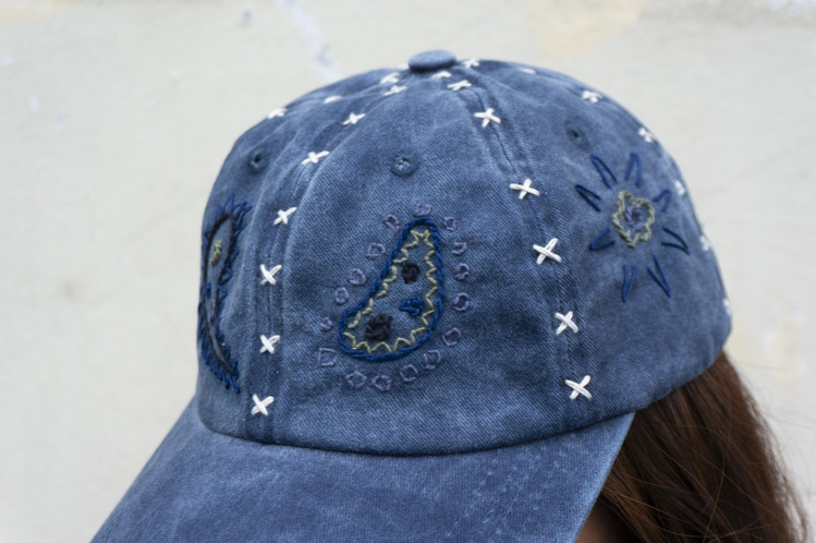 자연스러운 세월감의 네이비 색상이 인상적인 빈티지 캡에 굵은 실을 이용하여 완성된 손바느질 포인트들을 확인할 수 있습니다.
