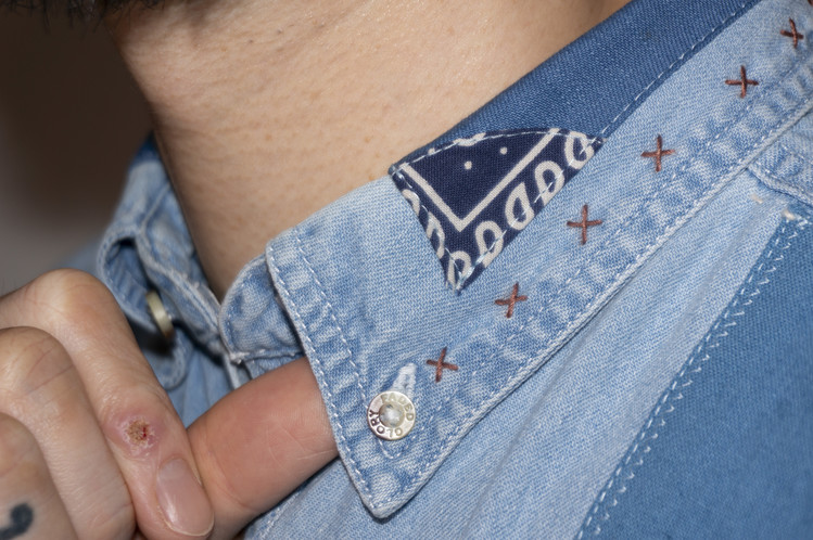그리고 두께감이 있는 여러 색상의 실을 활용하여 빈티지 반다나에서 볼 수 있는 에스닉한 문양들을 손바느질로 완성하여 대치되지 않는 위치에 자리하게 하고, 셔츠의 끝단들은 모두 핸드 스티치 작업으로 마무리 되었습니다.