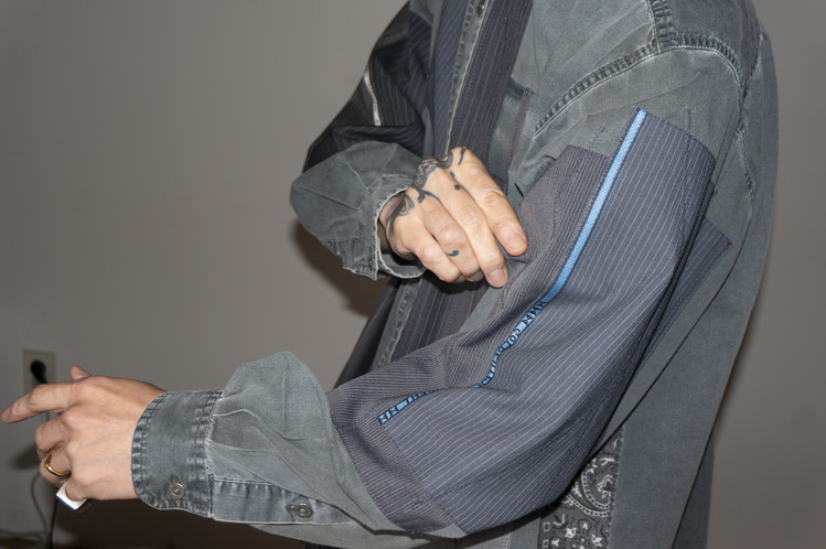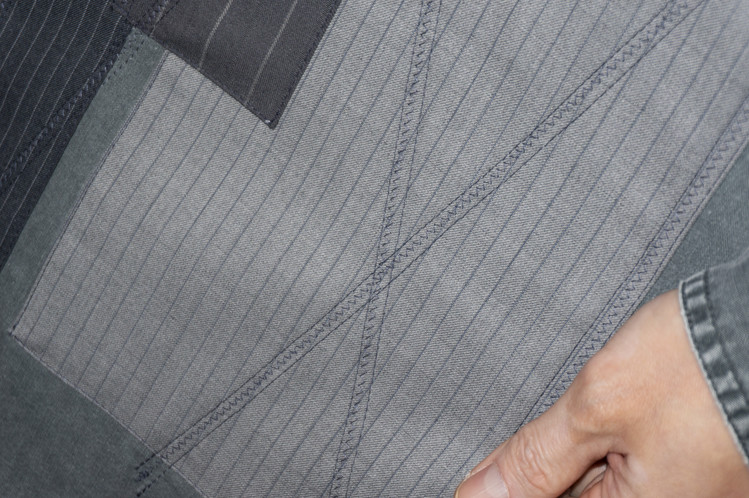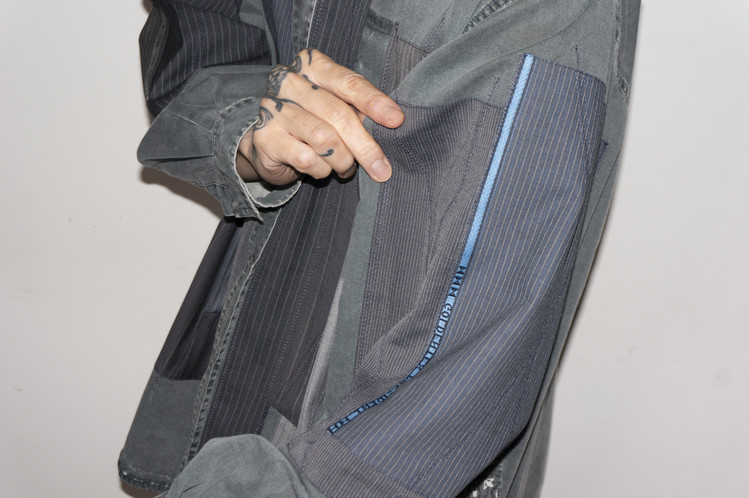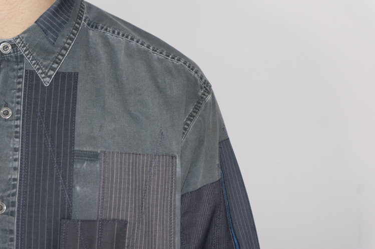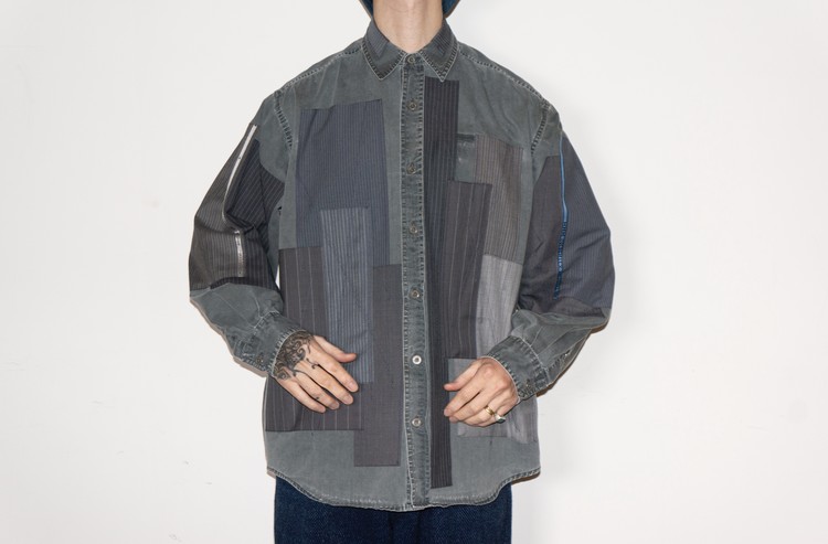 두껍지 않은 두꼐감의 코튼 셔츠에 그레이 색상 계열의 테일러 원단들을 이용하여 건축물과 설계도에서 영감을 받은 불규칙하나 정돈된 형태의 조화로운 패치워크를 확인할 수 있으며, 양쪽 소매에 테일러 원단의 혼용률과 출처가 나와 있는 리미지 파트를 사용하여 보다 좋은 포인트를 만들었습니다.
