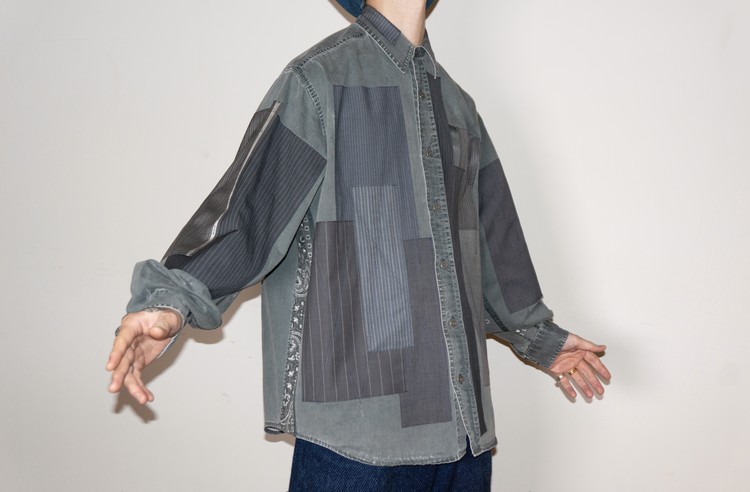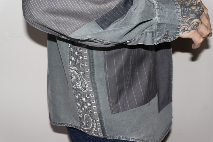 East oklm, The hand remake garments로 빈티지한 워싱감이 인상적인 그레이 색상의 면원단 셔츠에 테일러 원단을 패치워크하고, 반다나로 옆을 채운 셔츠 상품.